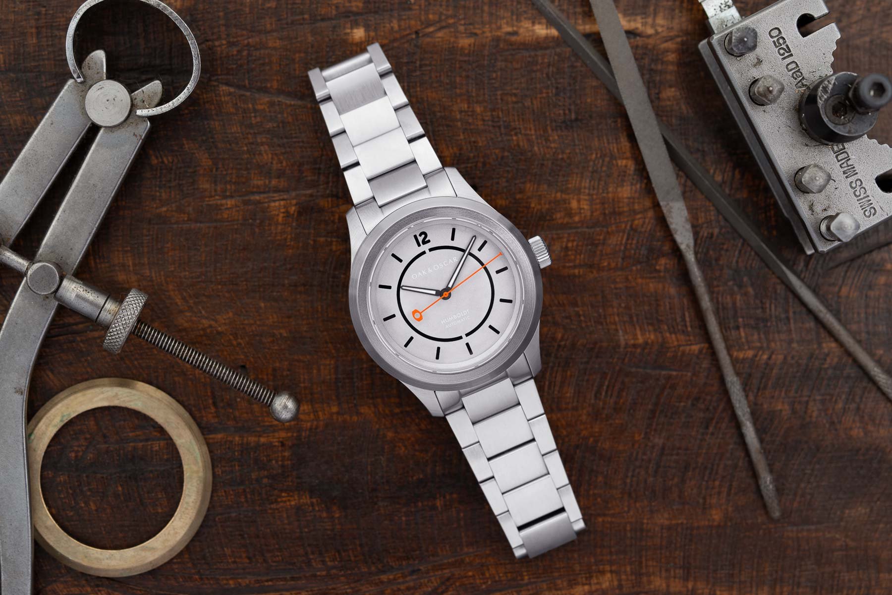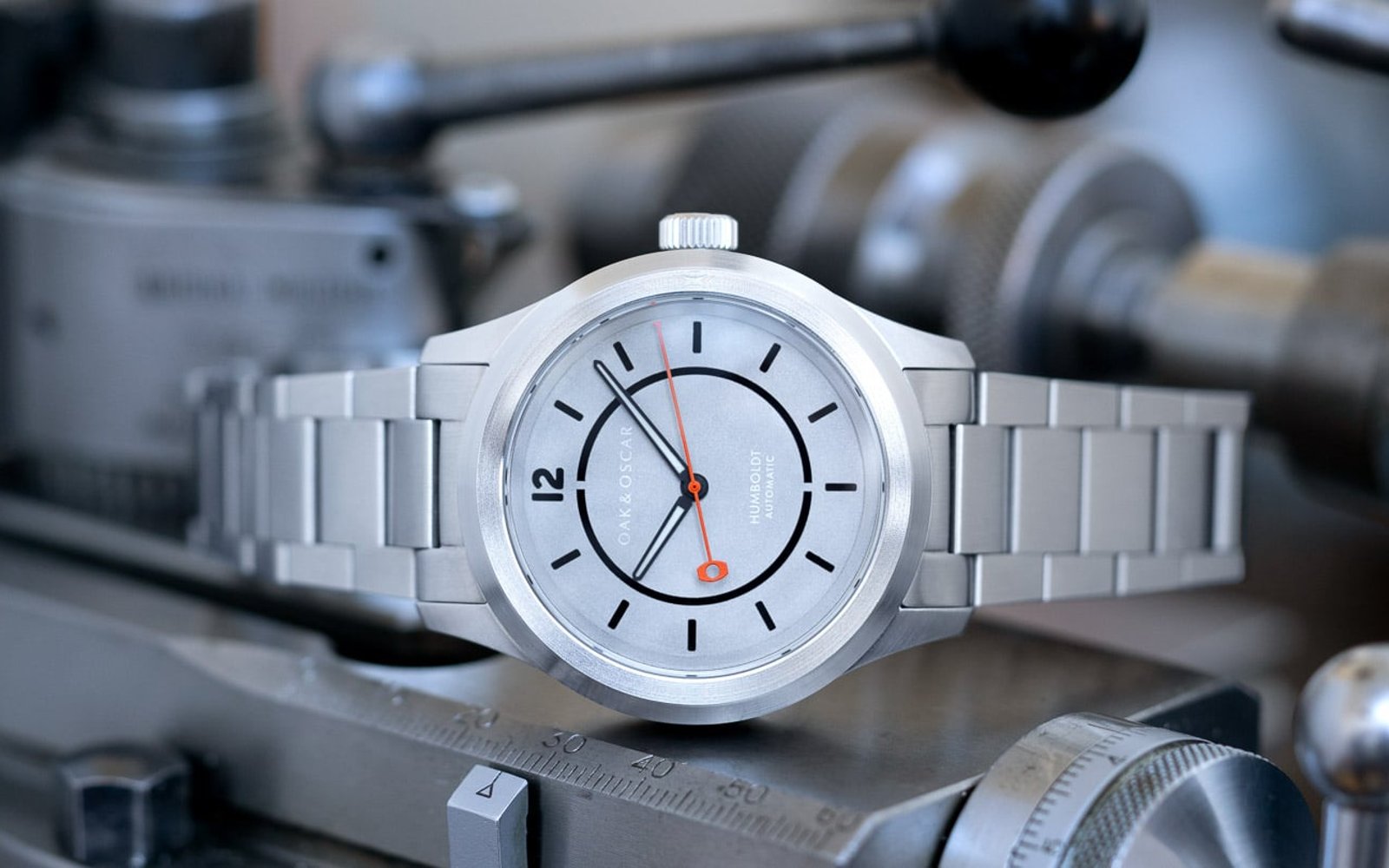 Also, the team at Oak & Oscar uses the lathe to produce the external stainless steel bezels. With this hand-machining operation, they can achieve impressive 0.01mm tolerances. Finally, the hour and minute hands with Super-LumiNova BGW9 and an orange sweeping seconds hand provide great legibility.