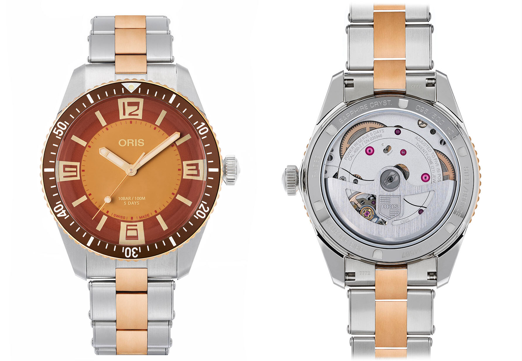 I love that the Collective guys went the whole nine yards and made this a two-tone watch. Although gold and steel would follow the usual two-tone formula, the much more affordable mix of bronze and steel perfectly complements the retro vibes. Regarding the movement, Collective opted for the Oris Calibre 400. This automatic movement, as most of you will know, operates at 4Hz and boasts an impressive 120-hour power reserve and a 10-year warranty. The movement is visible thanks to the sapphire crystal on the display case back.