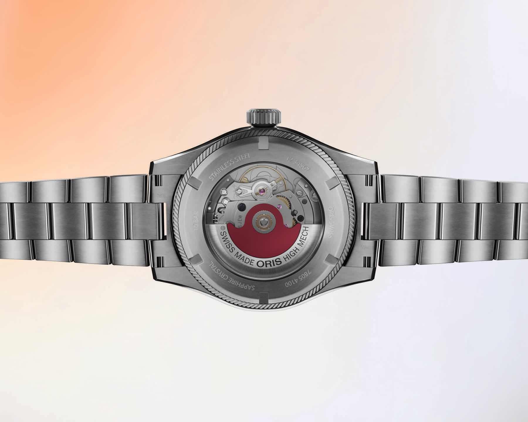 The Oris ProPilot Date uses a multipiece stainless steel case. Options are a stainless steel bracelet with a newly chamfered folding “LIFT” clasp or a suede strap that uses a seamless-fit adjustment and the same folding clasp. The sapphire crystal is domed on both sides and has an antireflective coating on its inner surface. The screw-in case back features a transparent mineral crystal. Oris rates the ProPilot Date’s water resistance at an ample 10 bar.