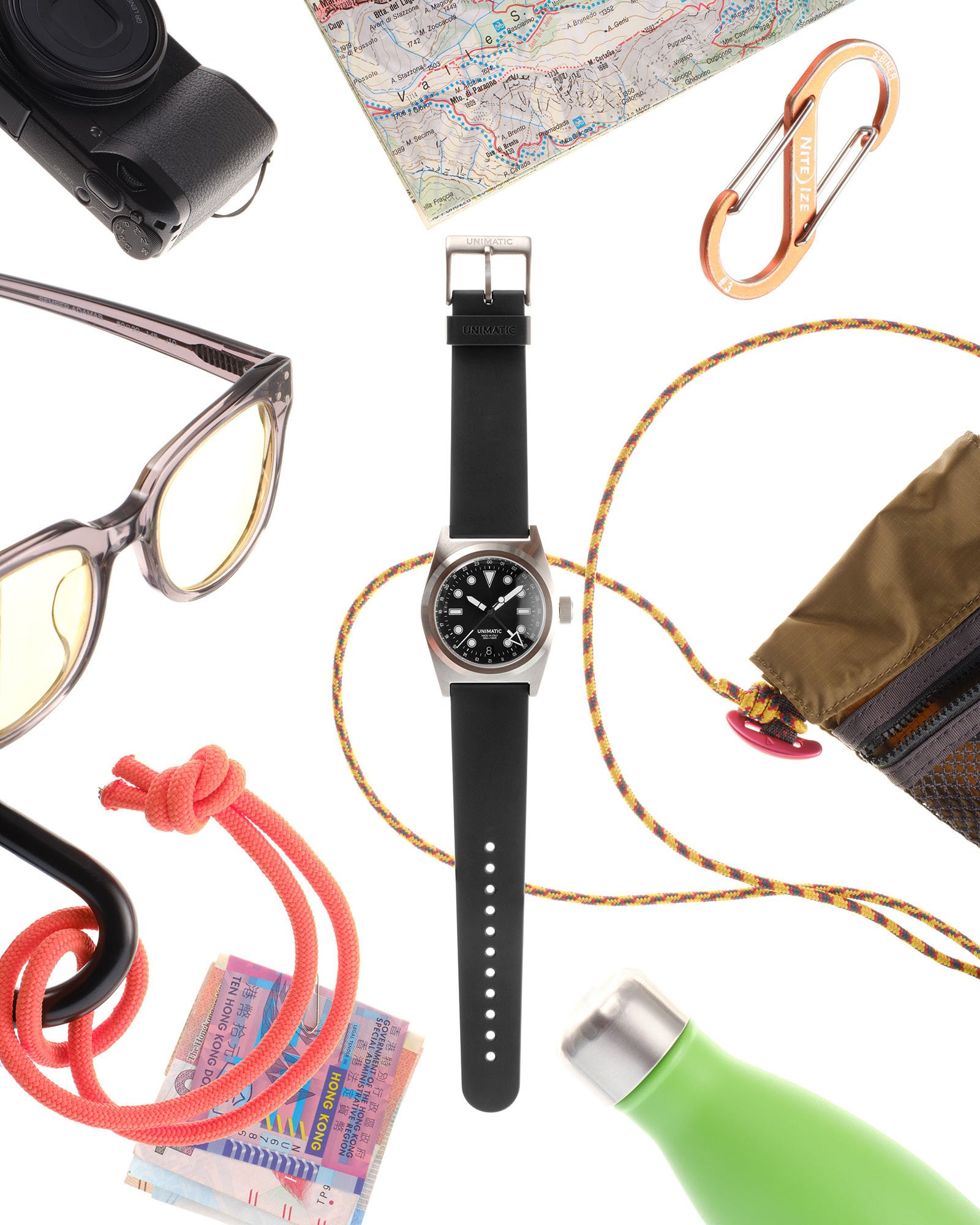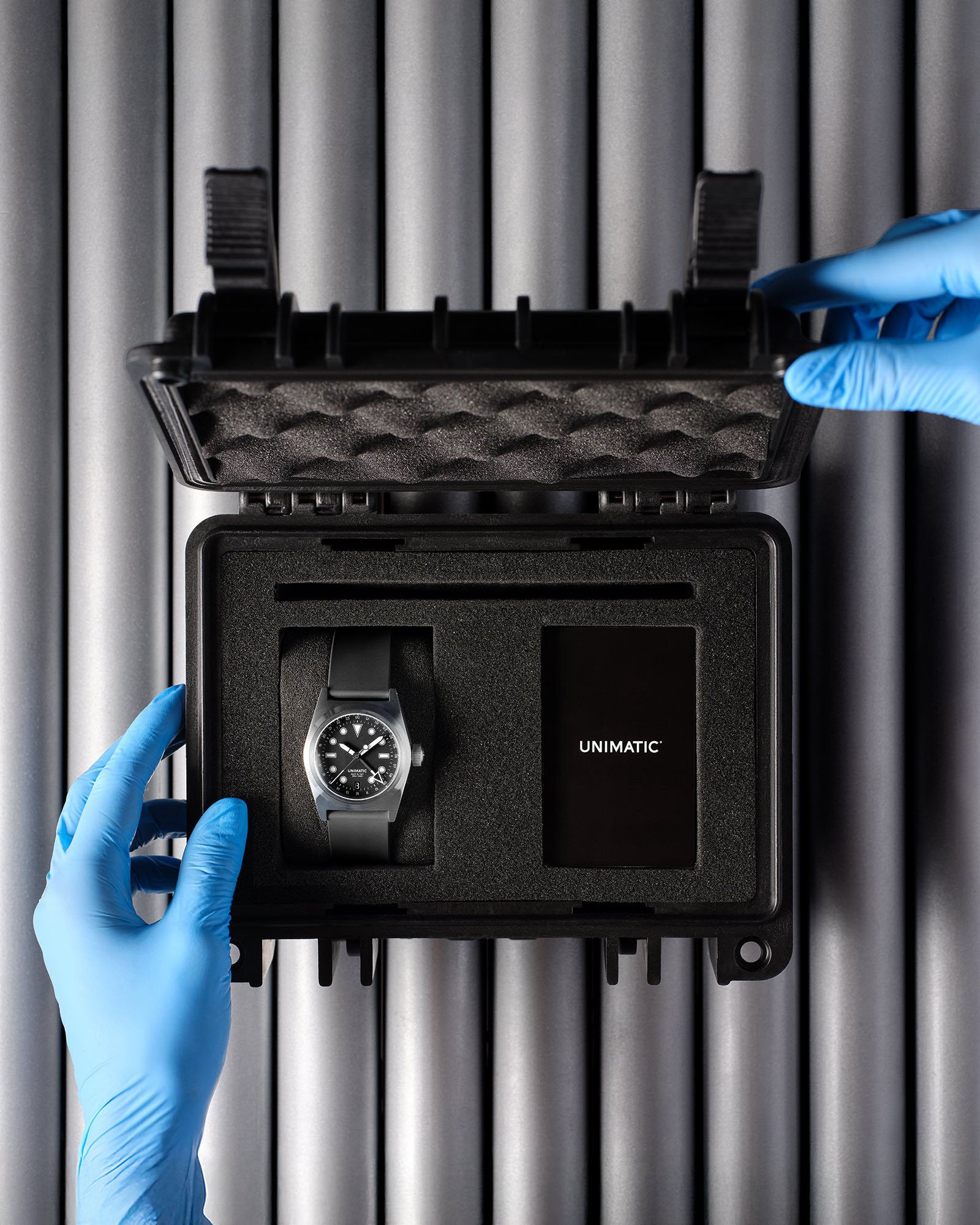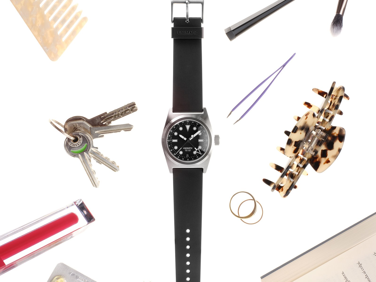 The new Unimatic Modello Due U2-GMT has a charcoal-gray tapered TPU two-piece strap with branded stainless steel hardware. This keeps the watch’s aesthetic straightforward, and I love that. Something is refreshing about seeing the first Modello Due GMT return to the brand’s black-and-white roots. Not only does it emphasize once more how easily the GMT function integrates into the overall design, but it also becomes a strong statement of style.