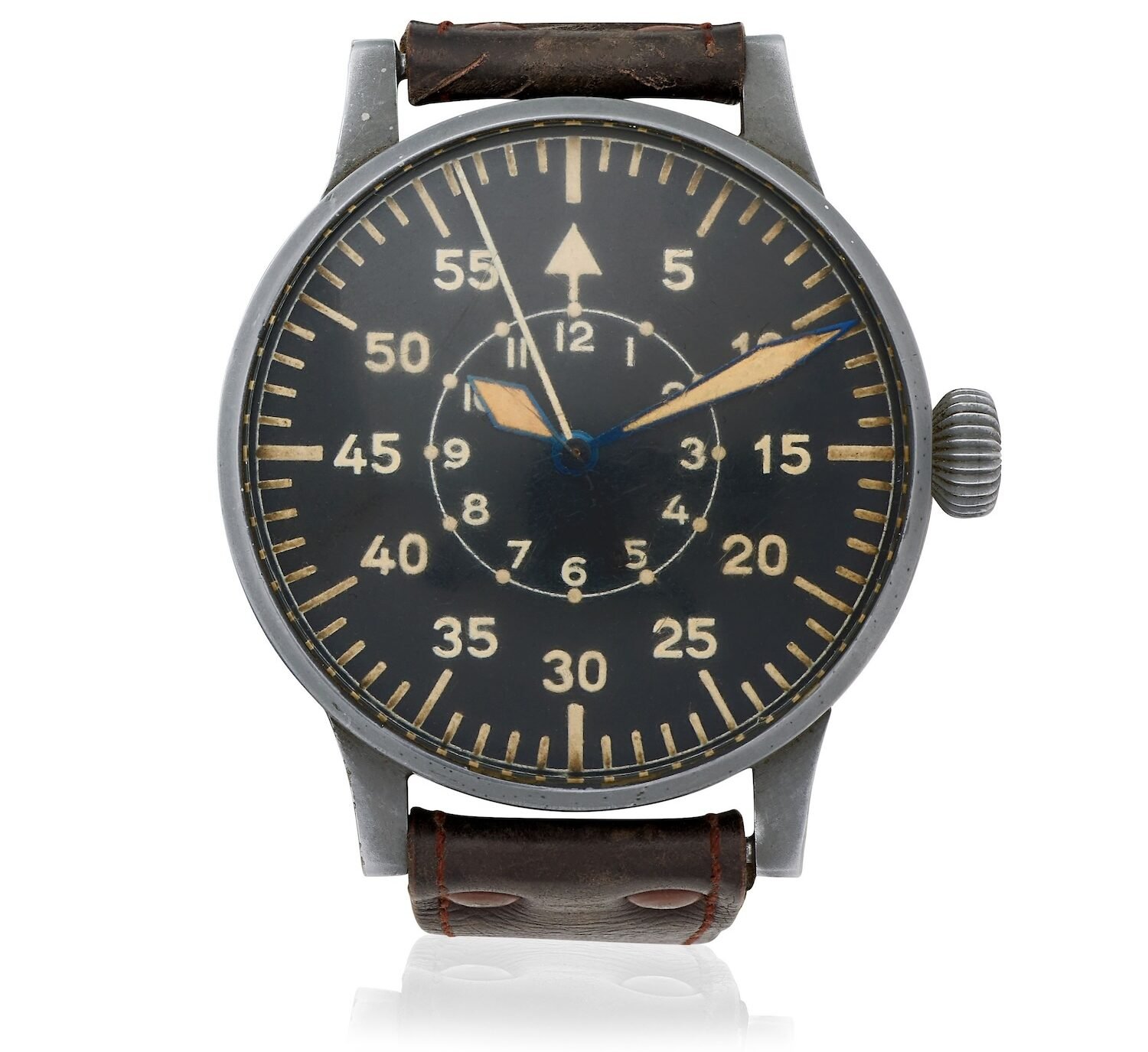 The first military spec required the dials to be black with white printing, for optimal legibility in bright cockpits. The layout became iconic for pilots’ watches up until today, with minute hashes all around and 11 Arabic-numeral hour markers printed beside them. Lastly, at 12, you find a triangle with two dots, intended to facilitate easy orientation. This symbol, too, became iconic, sometimes lovingly described as a chicken head-on.