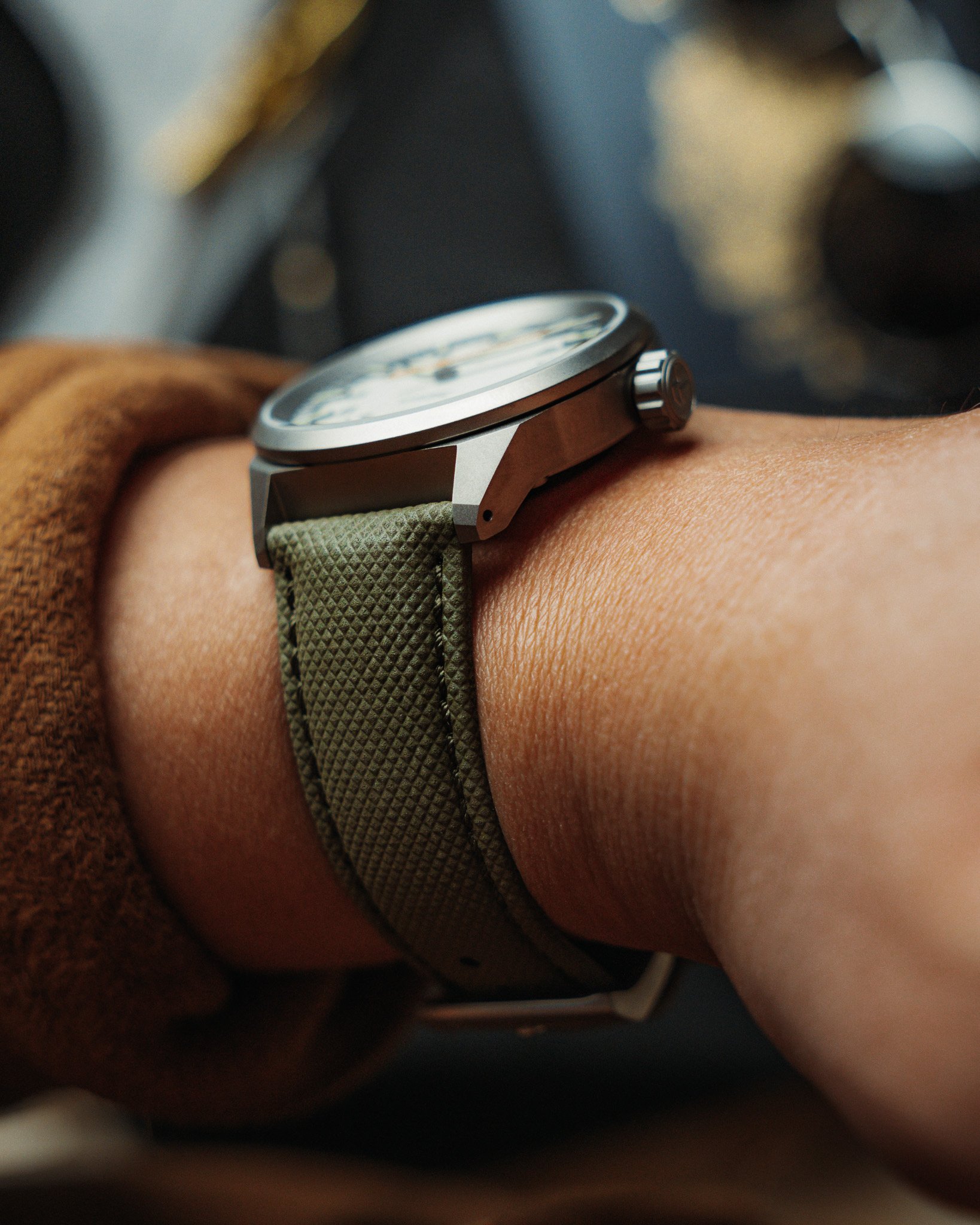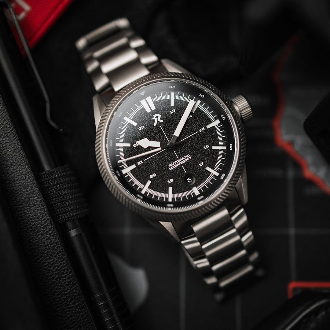 The watch comes on an RZE TecTuff strap, measuring 20mm wide and offering a bayonet-operated quick-release spring bar. Alternatively, you can opt for a titanium bracelet with a flattened five-row design.