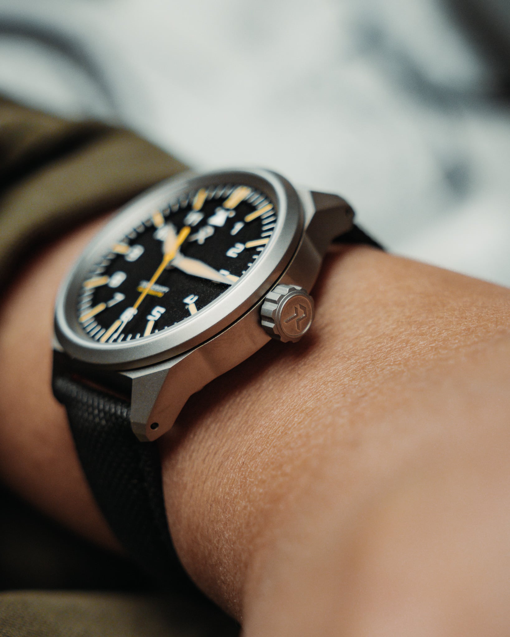 While the white and yellow variants feel thoroughly modern, the black adds a hint of vintage flavor. The usually crisp white lume is executed in an aged-radium-like hue here. Interestingly, through its contrast with the stark, modern case, it appears more beige than faux patina. After all, this doesn’t look like a recently unearthed 80-year-old relic in the slightest.