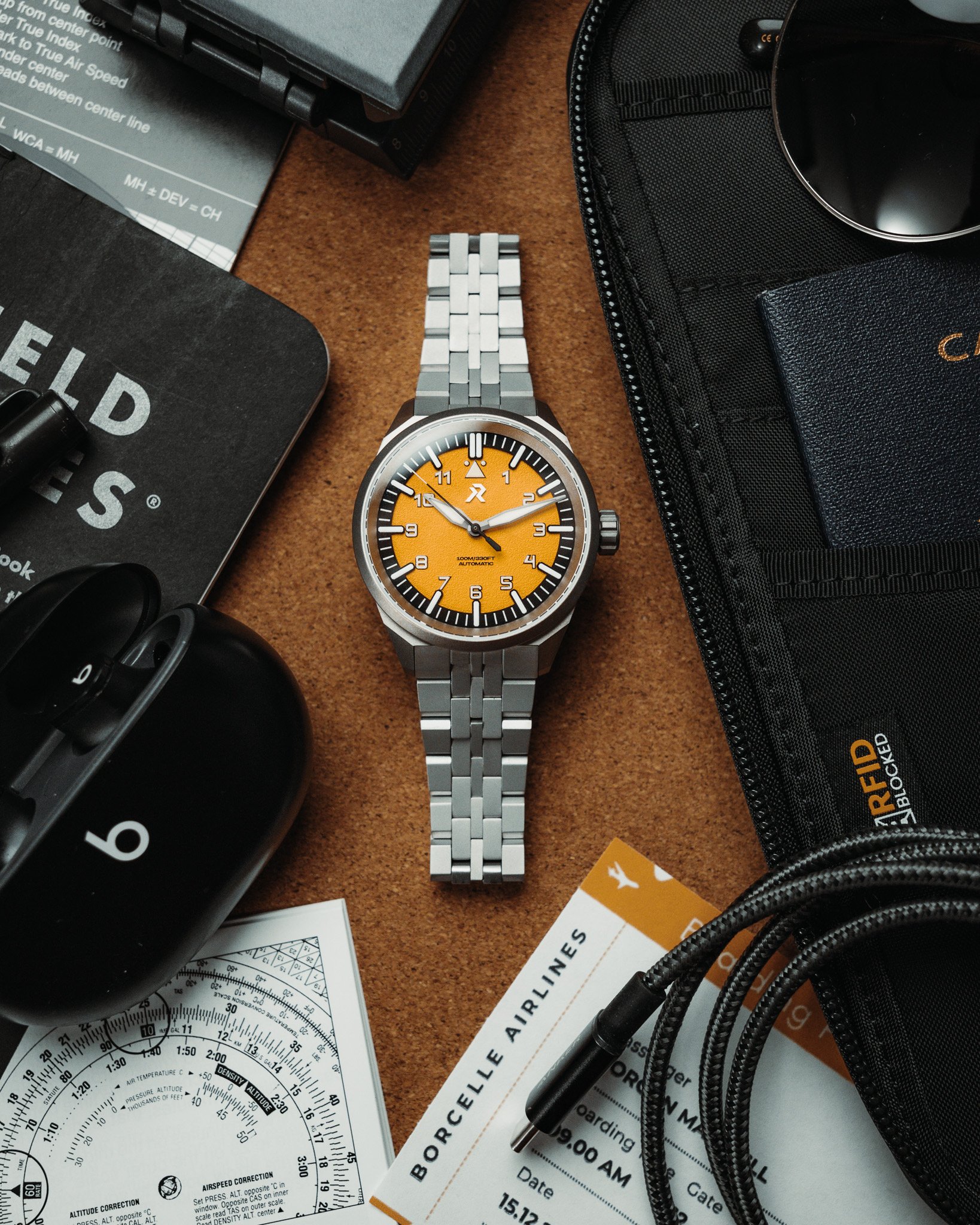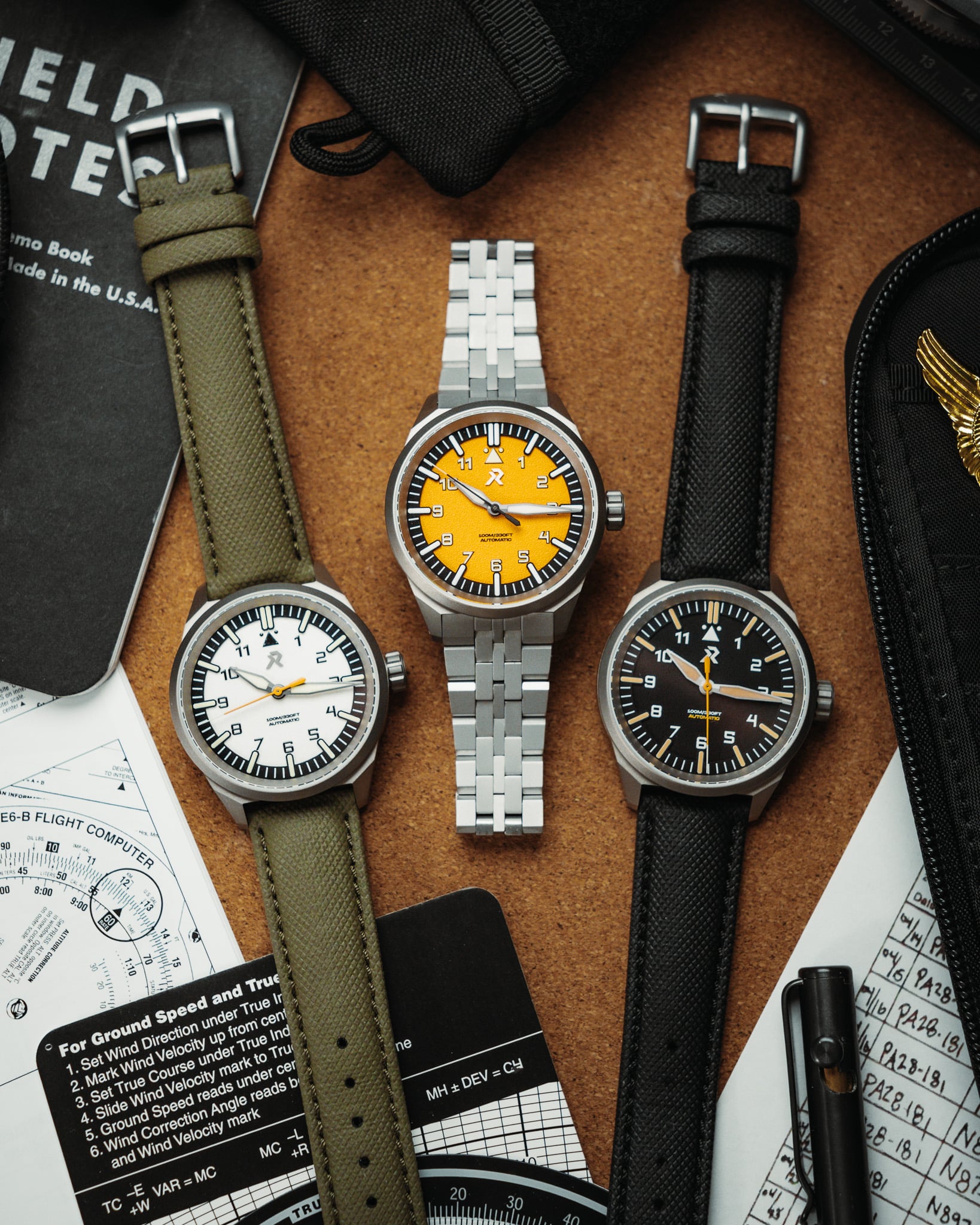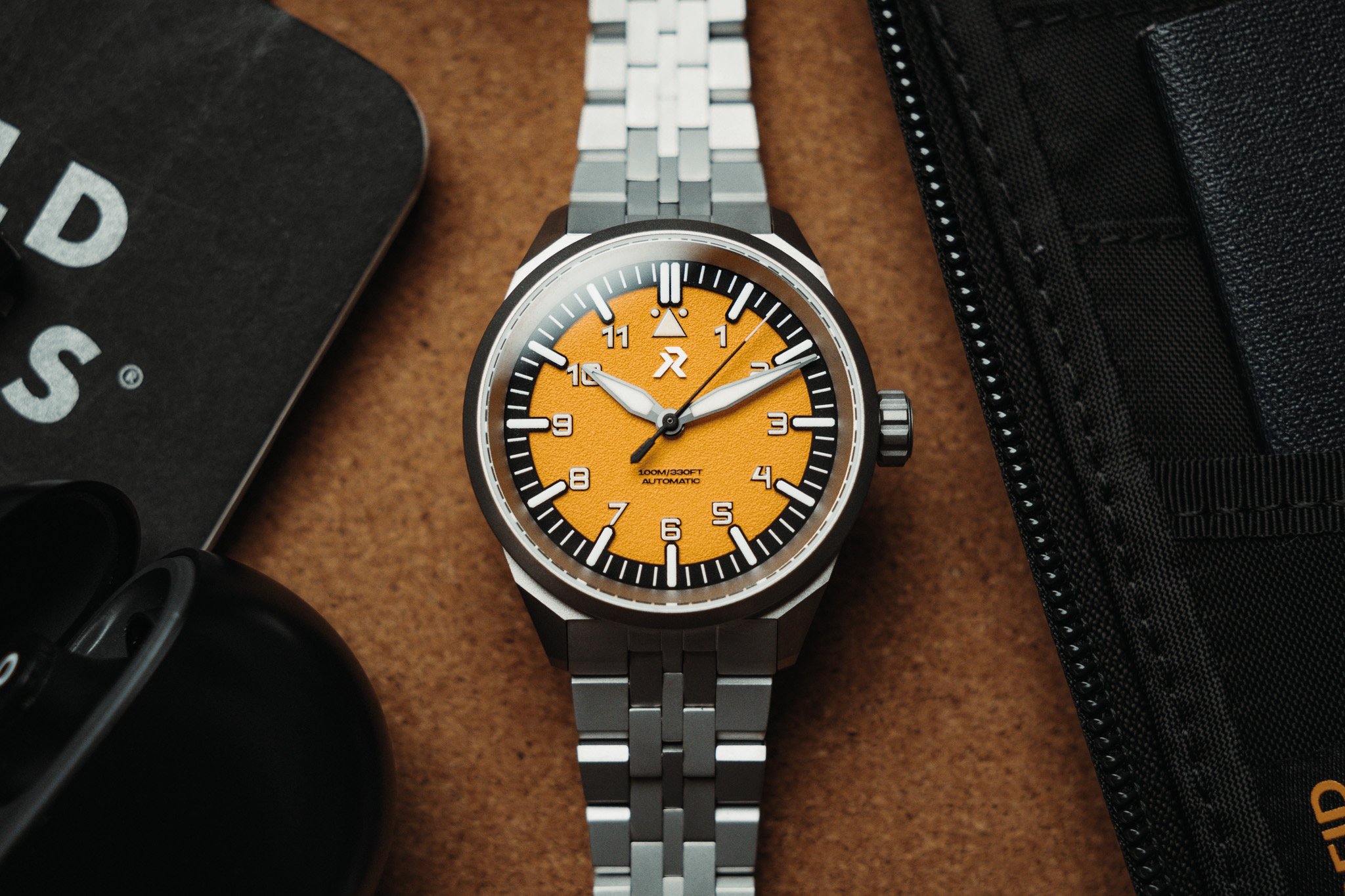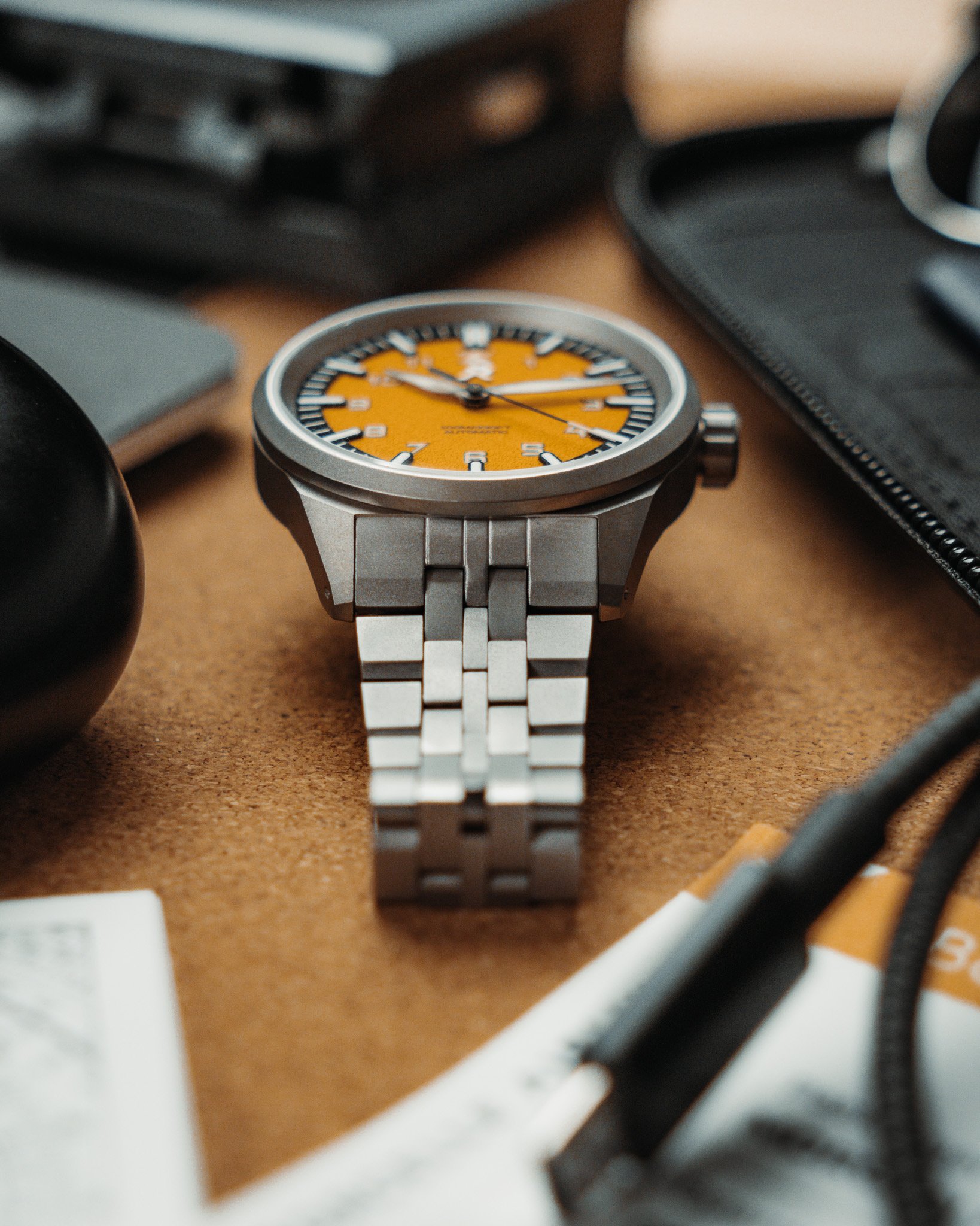 Out of the three, the yellow dial is probably the most like RZE. We’ve seen this signature color on several of the brand’s models, including the typical grainy texture. The black and white variants further modernize the theme with a pale orange seconds hand.