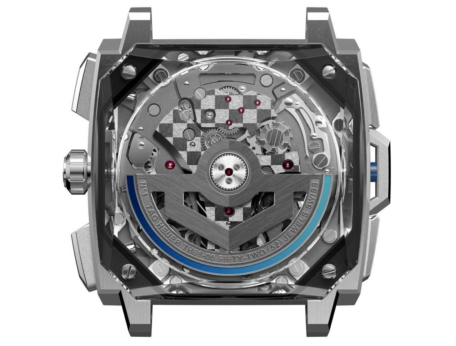 So, what do we have here? The new Monaco Split-Seconds Chronograph boasts a 41mm titanium case. Unlike the 1969 original, the crown has moved to the right, making way for the split-seconds (rattrapante) pusher at 9 o’clock. Sapphire crystals close off the case on both the top and bottom. The case back, interestingly, is fully sapphire rather than merely outfitted with a sapphire window. The dial, too, is made out of sapphire, showcasing the movement beneath. The movement, however, isn’t skeletonized, so the view is limited.