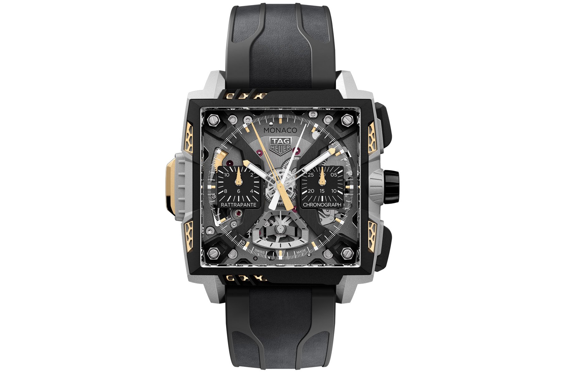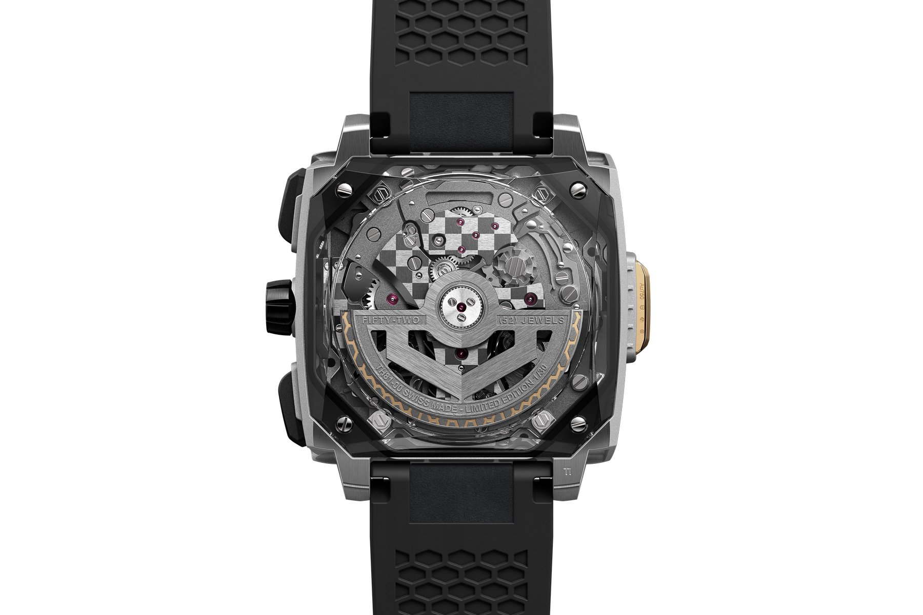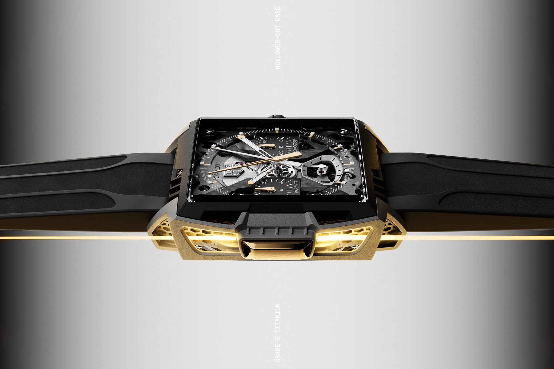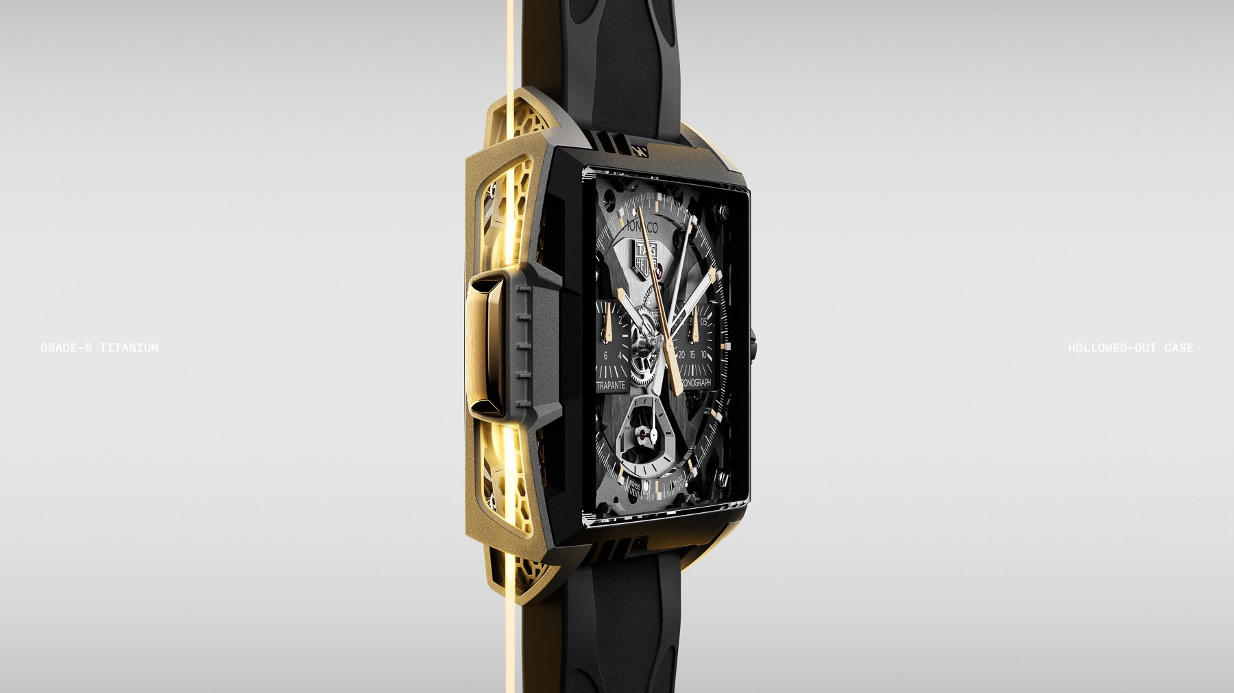 The watch works with the current Monaco’s 41mm by 47.9mm dimensions, but the comparisons end there. The case is a wild amalgam of Grade 5 titanium, sapphire, and 2N yellow gold. Instead of using a traditional CNC-machined case, TAG Heuer applied Selective Laser Melting (SLM) technology to build the case layer by layer from Grade 5 titanium powder. A laser melts the powders and fuses them to create a near-final shape, which can then be polished. The outer case and side lattice structures are made using this time-intensive process. As a testament to the difficulty of the technology, it takes five times longer than traditional machining. The result, however, is a strong but skeletonized 15.2mm-thick case weighing 85 grams. Finally, the right side of the case has black DLC pushers and a tapered crown.