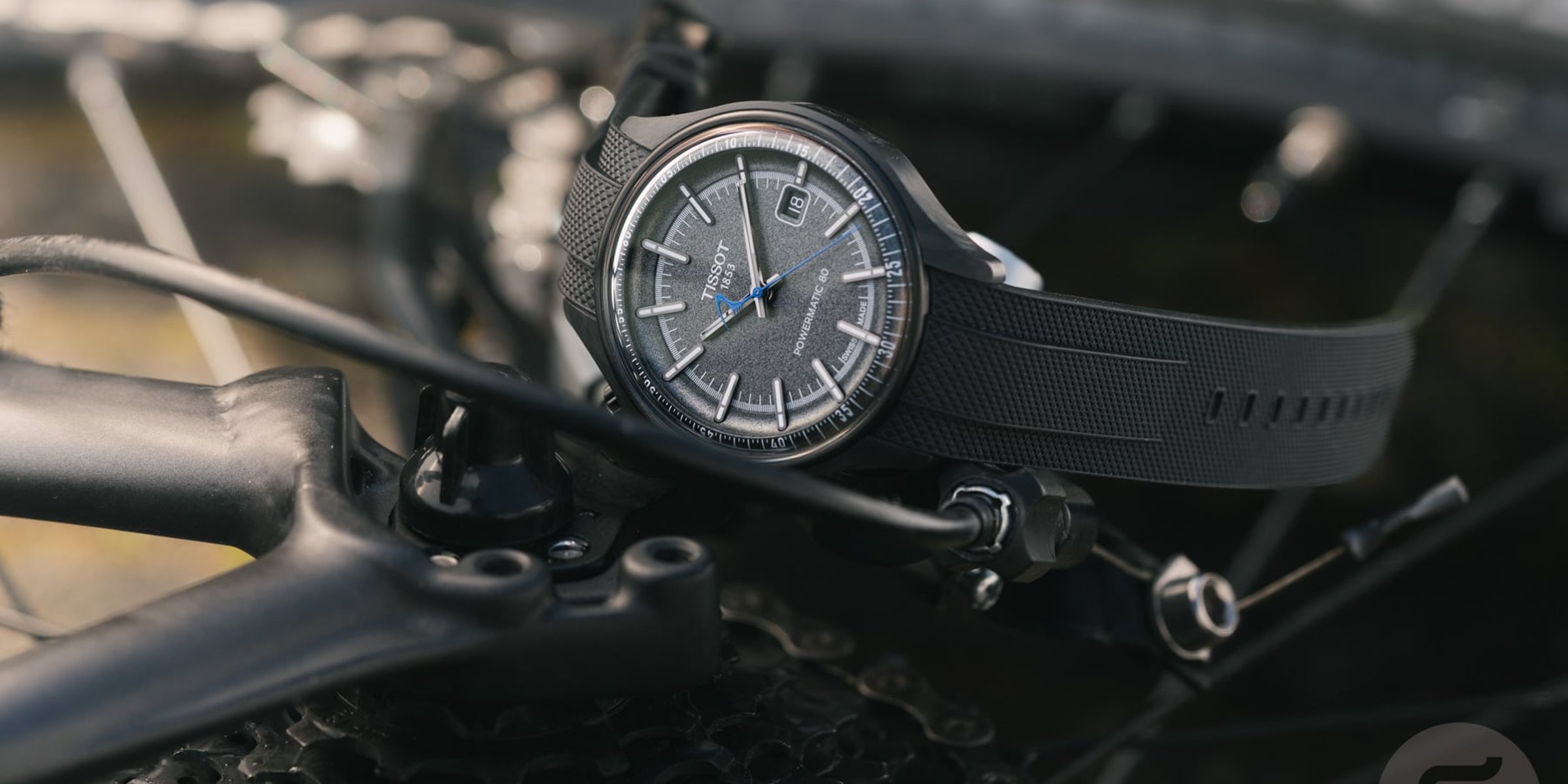 This light 74g watch comes fitted with a textured black rubber strap with curved, case-hugging ends, quick-release spring bars, and a black-coated pin buckle. This is the strap you’ll want to wear while on the bike. Providing the power is a COSC-certified Powermatic 80, C07.611 movement with an antimagnetic Nivachron balance spring.