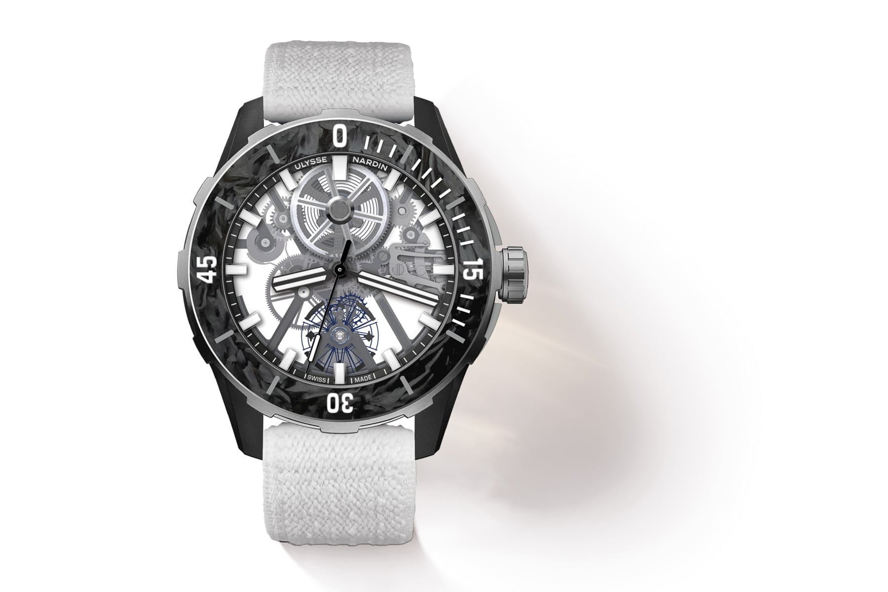 The case flanks of the Diver Air are also innovative and made from 60% nylon and 40% carbon fiber. Here, Ulysse Nardin worked with Fil & Fab, a French recycler of fishing nets, to supply the nylon. The carbon fiber is sourced by Extracthive, a company that refines carbon fiber from the hulls of racing sailboats. Lavoisier Composites then combines the two materials to create the unique Nylo-Foil with its distinctive, marbled surface finish.