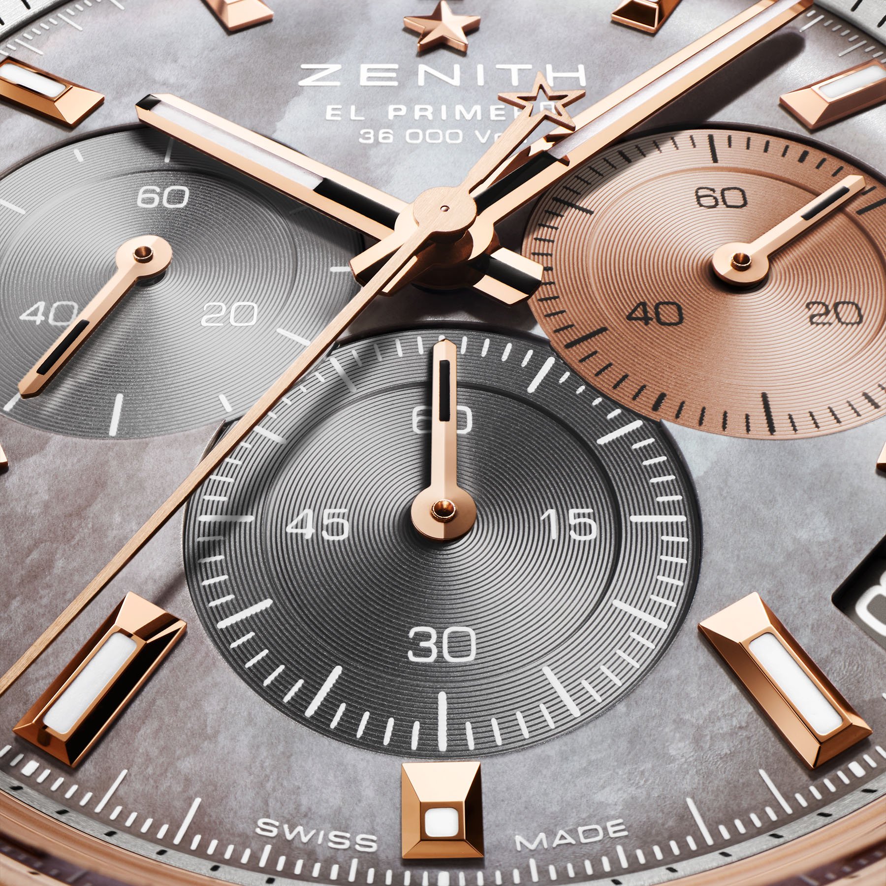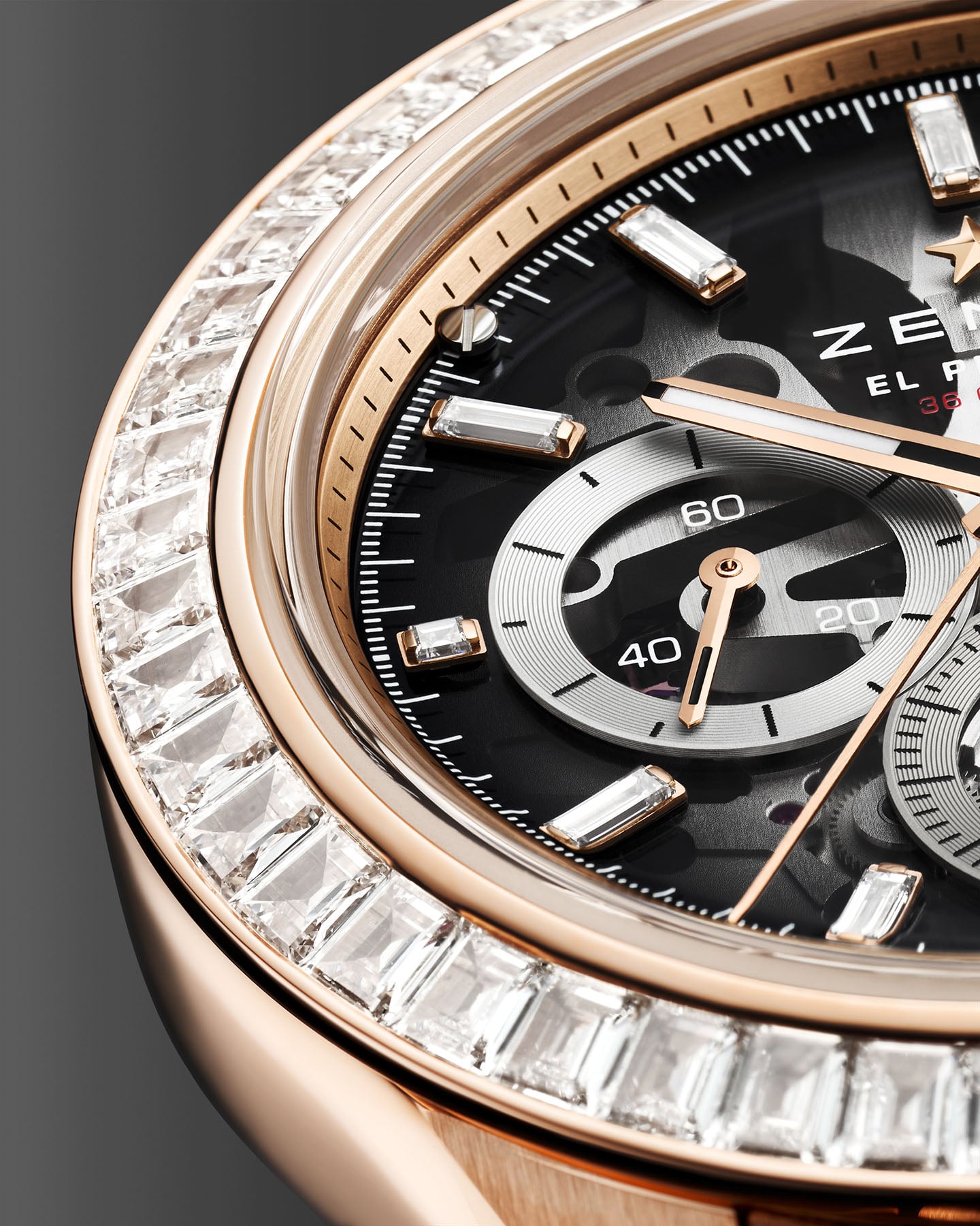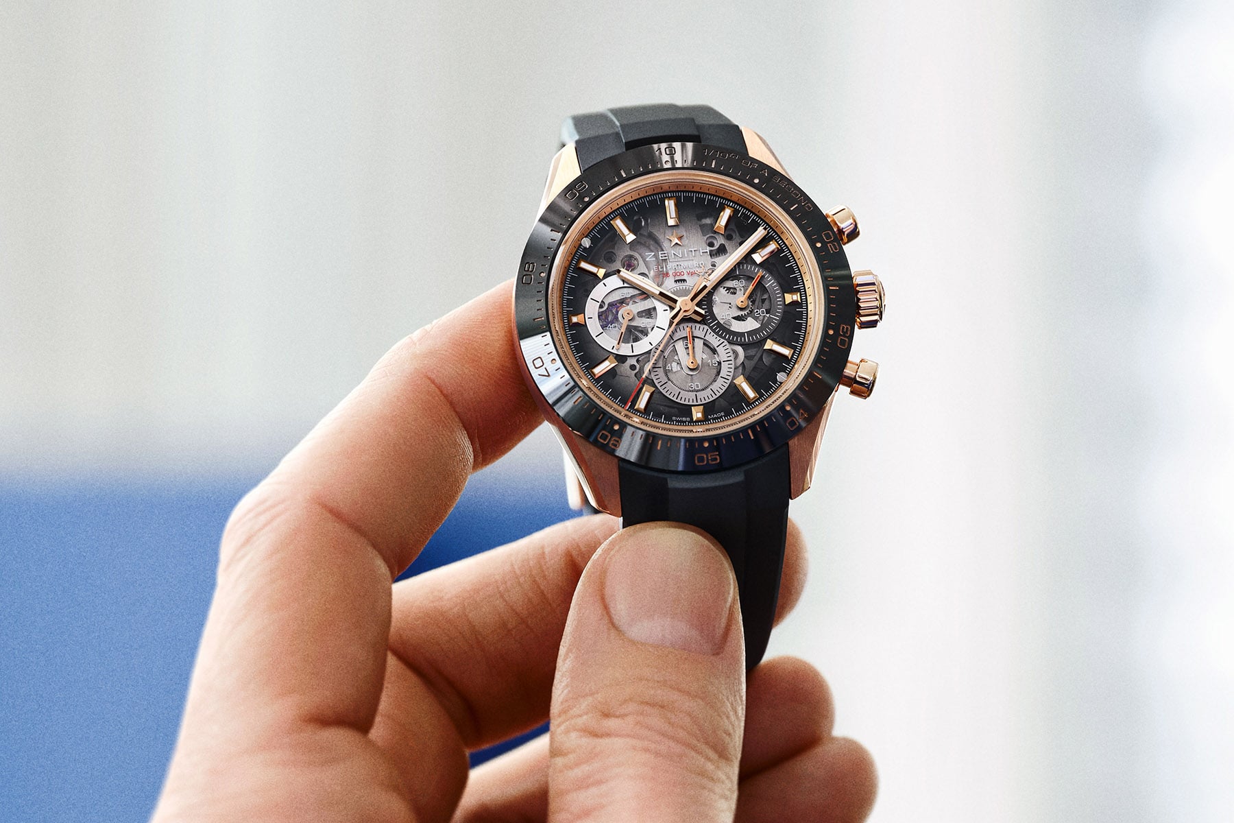 Zenith also expands the Skeleton range with an 18K rose gold model paired with a black ceramic bezel. The black rubber strap grounds the gold nicely. Sub-dials shift to muted gray tones, allowing gold elements to shine. In this configuration, the smoky dial works especially well, offering a subtle glimpse behind the curtain to the movement.