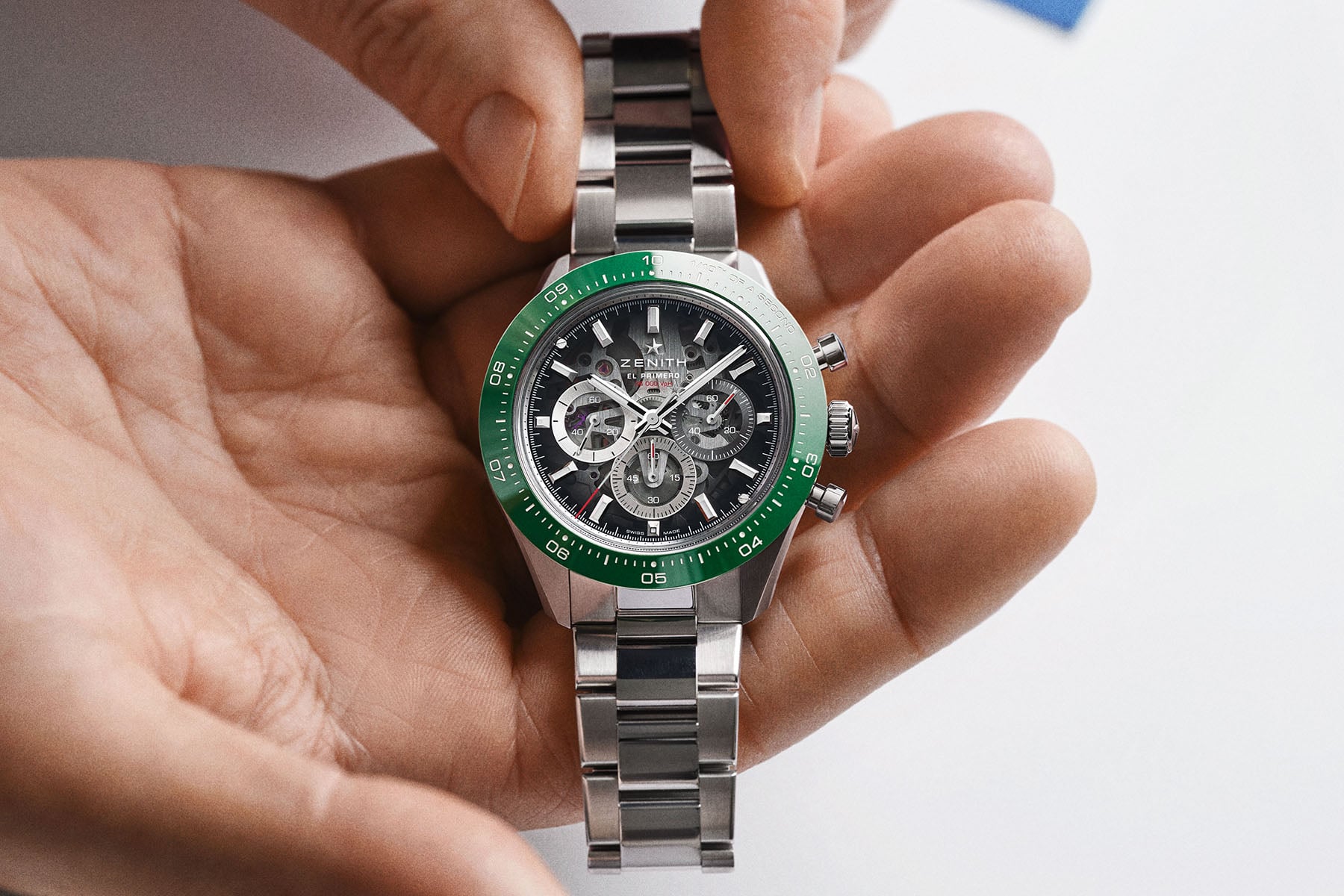 Zenith’s technicians carefully remove material while preserving the caliber’s structural integrity. This step is critical for a high-beat movement, in which added vibration places stress on load-bearing components. The additional work earns the movement a new name — El Primero 3600SK. As mentioned earlier, the two stainless steel versions come with either green or black ceramic bezels, but these references hide a special trick up the sleeve, which we’ll come to shortly.