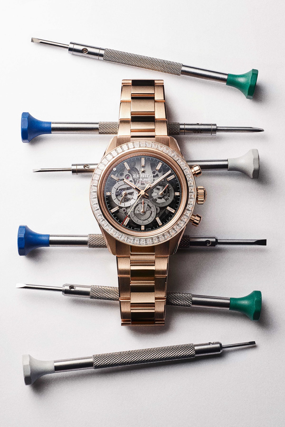 Zenith also introduces two precious-metal Skeleton references. One comes in 18K rose gold with a black ceramic bezel and a black rubber strap. The other is a 10-piece limited-edition version with a full-rose-gold bracelet and 52 baguette-cut diamonds set into the bezel. All Skeleton models omit the date, yet the two-tone mother-of-pearl version retains it at 4:30. Each watch’s 41mm case has a 100m water resistance rating.