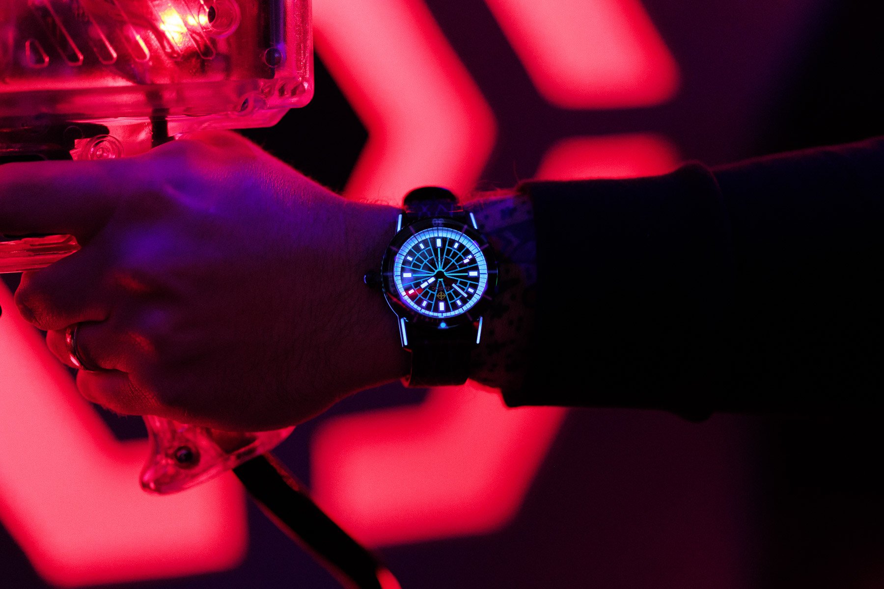 But that’s not where it ends, either. The lines on the case also light up, as does the logo on the crown. The result is two watches that illuminate in a way that I have never seen before. And to come back to the concept again quickly, there are two versions because laser tag is played with two teams. Each team needs to be easily identified to see who is with you and who is against you. These two watches make that very easy indeed.