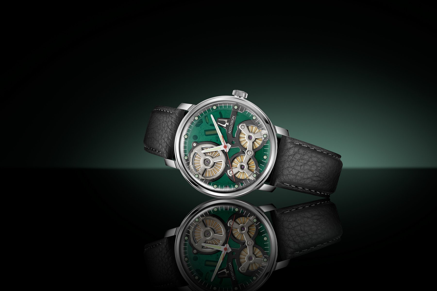 So, what’s actually new about these two models compared to the ones from two years ago? Well, the first one received a “gray treatment”, meaning most of the dial/movement is gray with Accutron green accents. It also comes on a bracelet, which is a first for this modern series. The other version on a strap has received a “green treatment”, meaning most of the dial/movement is green with gray accents. Both models have 50 meters of water resistance, a transparent minute track, and green lume plots. Objectively, what seems to differentiate these two models from the 2020 ones are the colors of the dial and lume plots. The technology and the dimensions of the watches remain the same.