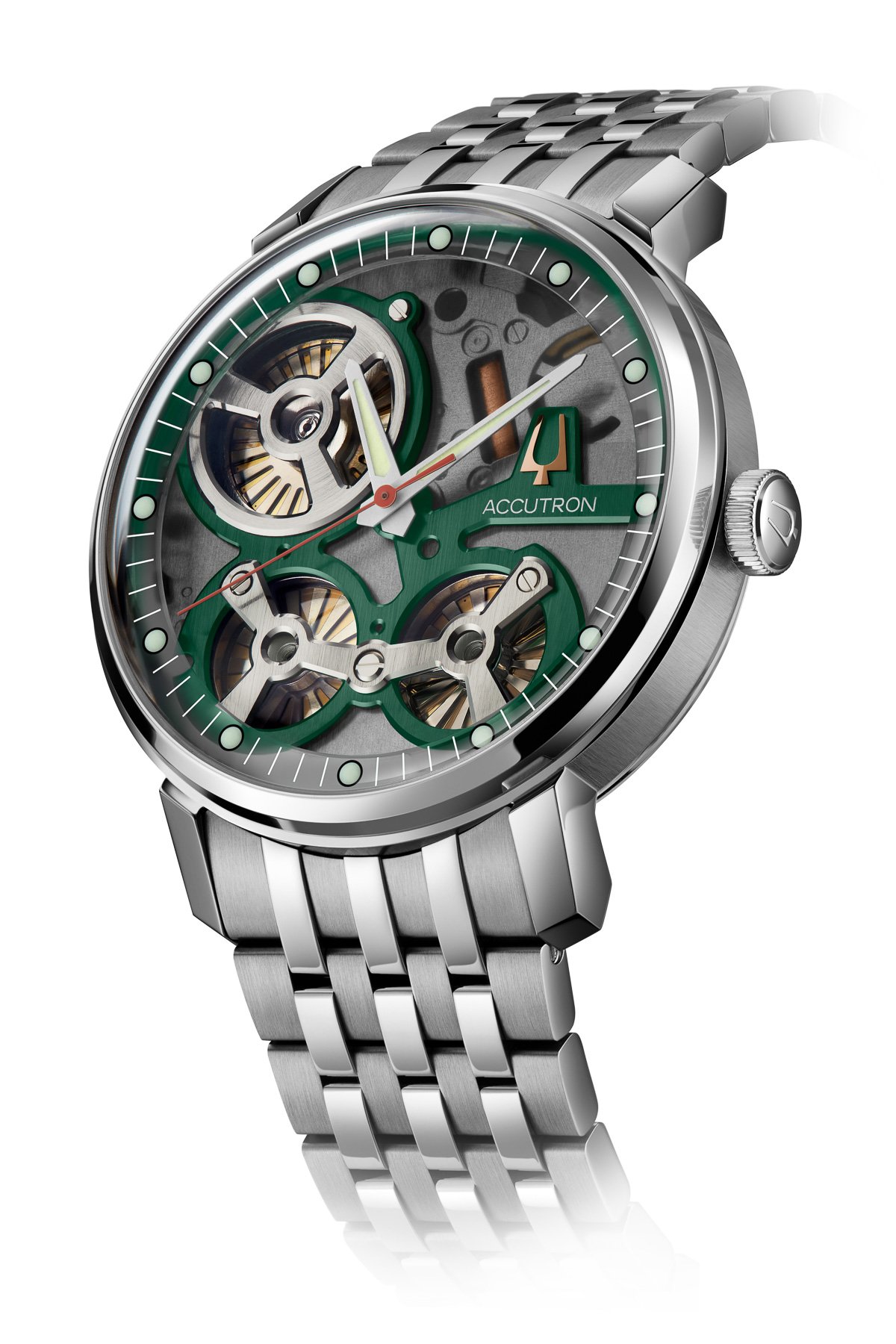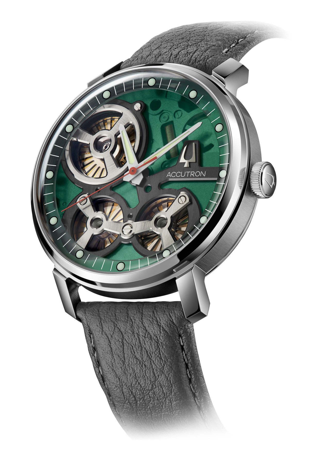 So, what’s actually new about these two models compared to the ones from two years ago? Well, the first one received a “gray treatment”, meaning most of the dial/movement is gray with Accutron green accents. It also comes on a bracelet, which is a first for this modern series. The other version on a strap has received a “green treatment”, meaning most of the dial/movement is green with gray accents. Both models have 50 meters of water resistance, a transparent minute track, and green lume plots. Objectively, what seems to differentiate these two models from the 2020 ones are the colors of the dial and lume plots. The technology and the dimensions of the watches remain the same.