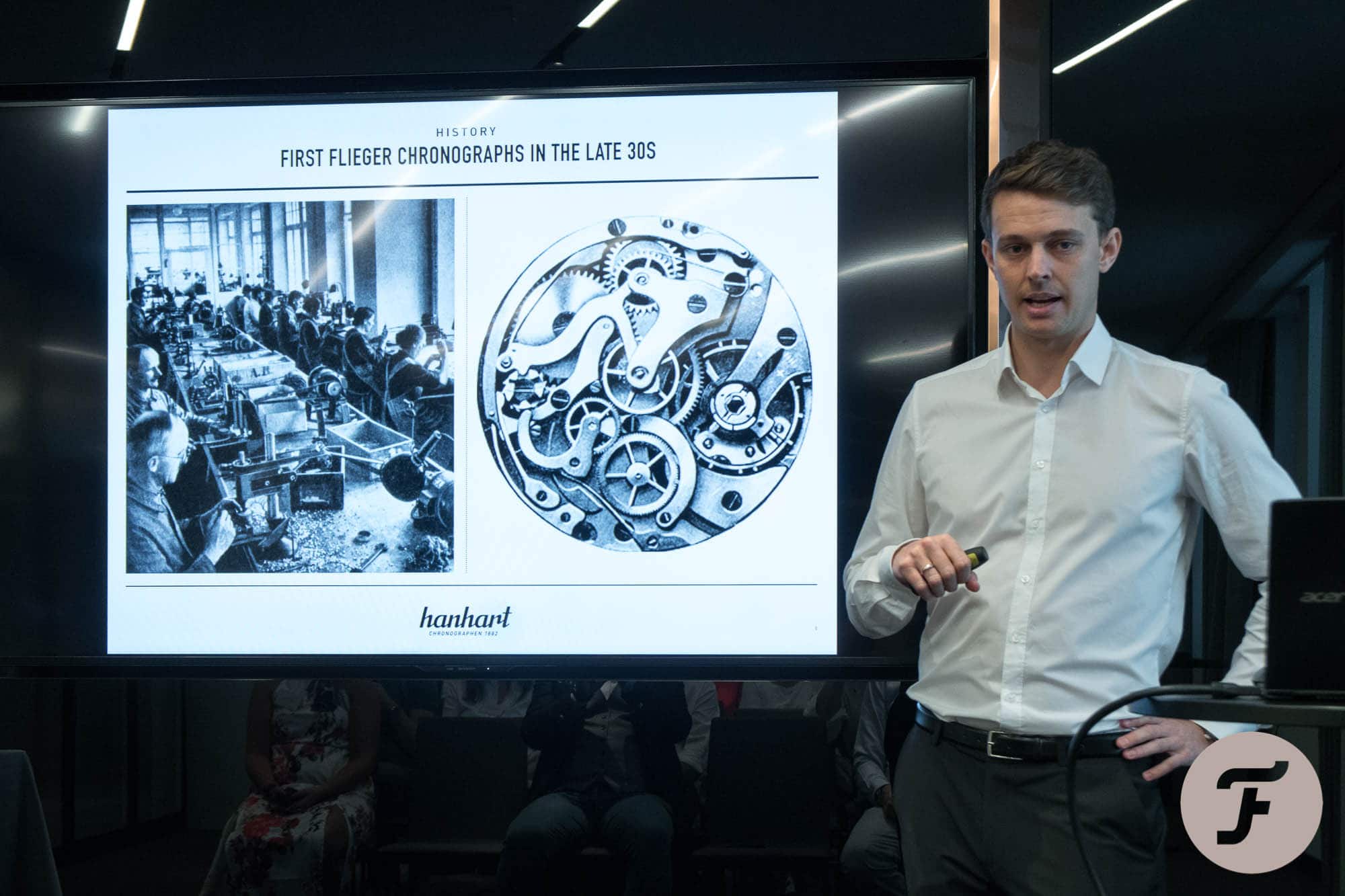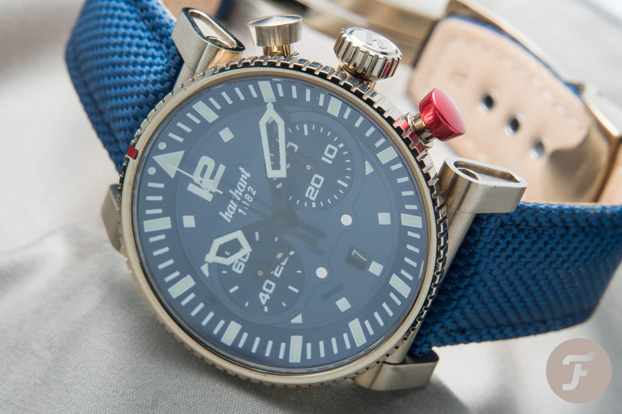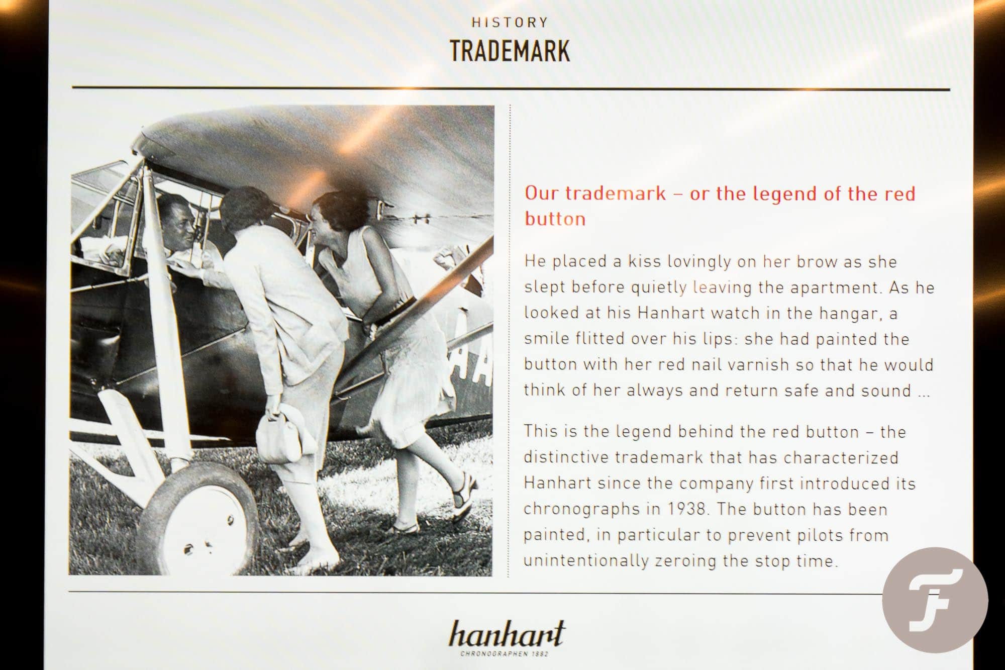 During the presentation, we learn about the remarkable red button on their chronographs. Many chronographs in the past had a flyback function. So it would reset instantly and basically, the red button was to make you think twice before using it. Hanhart believes there’s a story to it though, about a pilot who left home to go on a mission. When he was about to step into his plane, he noticed that his wife had painted one pusher with nail-polish. See below.