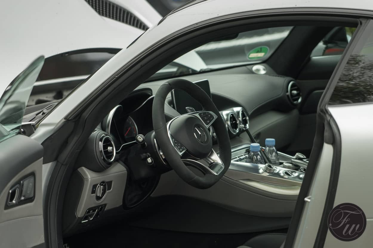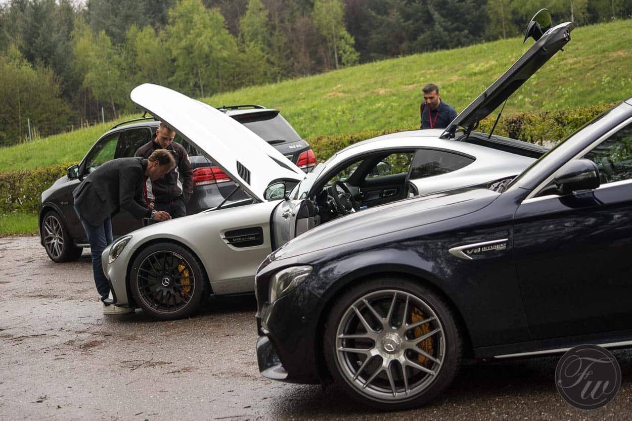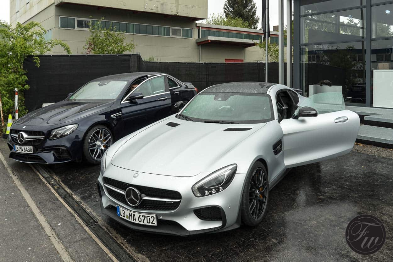 So after picking up our rental we went towards Germany where we arrived after a few hours. Time to change the Mercedes 180 for an AMG GT s and the AMG E 63 s. As soon as we sat down behind the wheel we wait for the magic words “ESP off”, but that is not going to happen for now. We quickly realize there is a reason for ESP to remain switched on. On the damp and curvy roads we need all the traction there is to get the cars through the curves as fast as we want. With the rear wheel driven AMG GT s we already feel how the car is searching for all the grip possible with the immense power that is put onto the wheels.