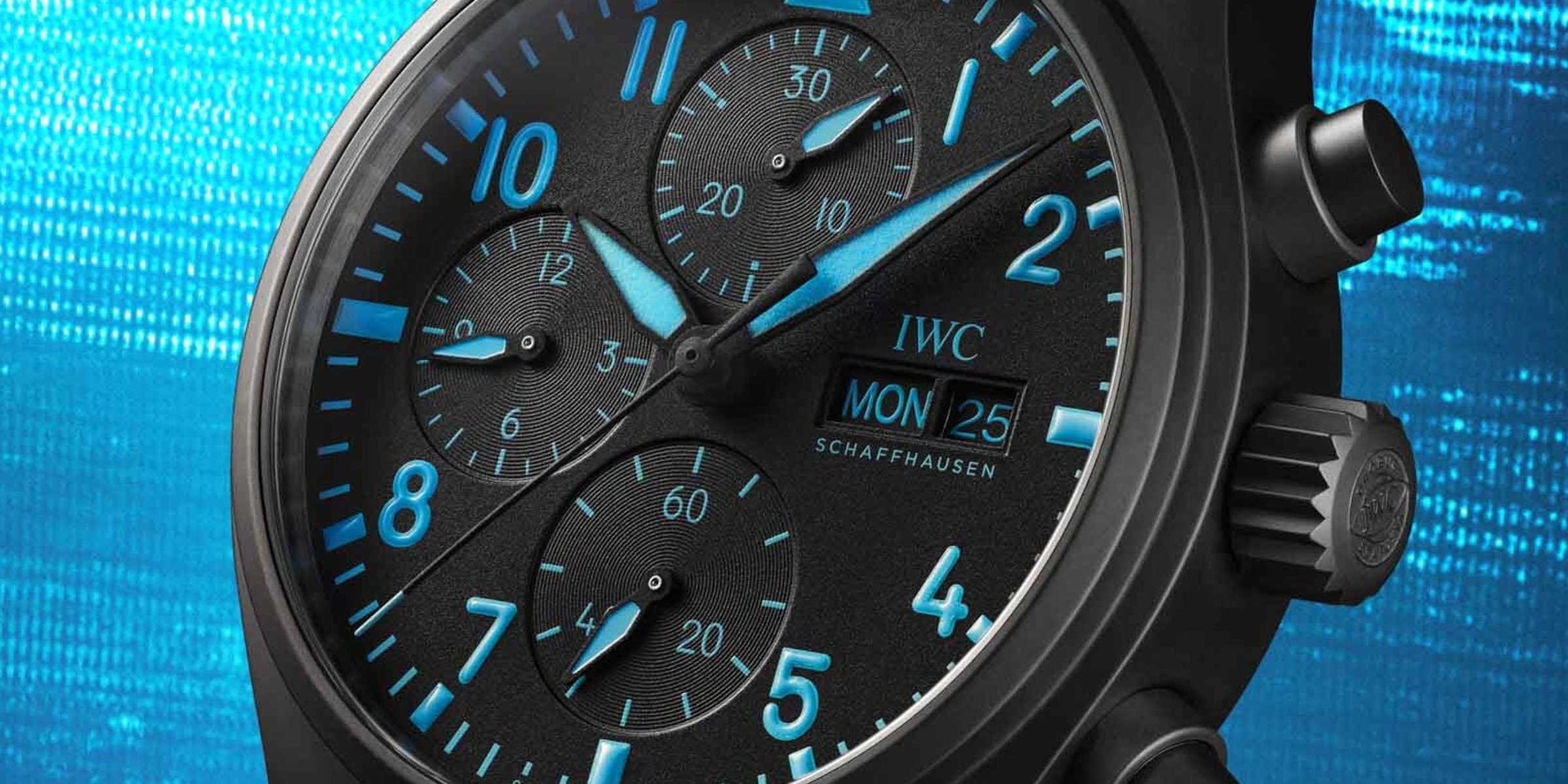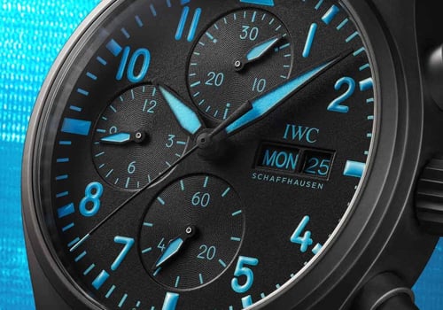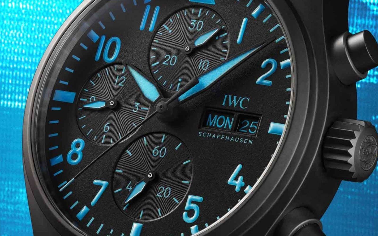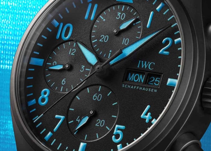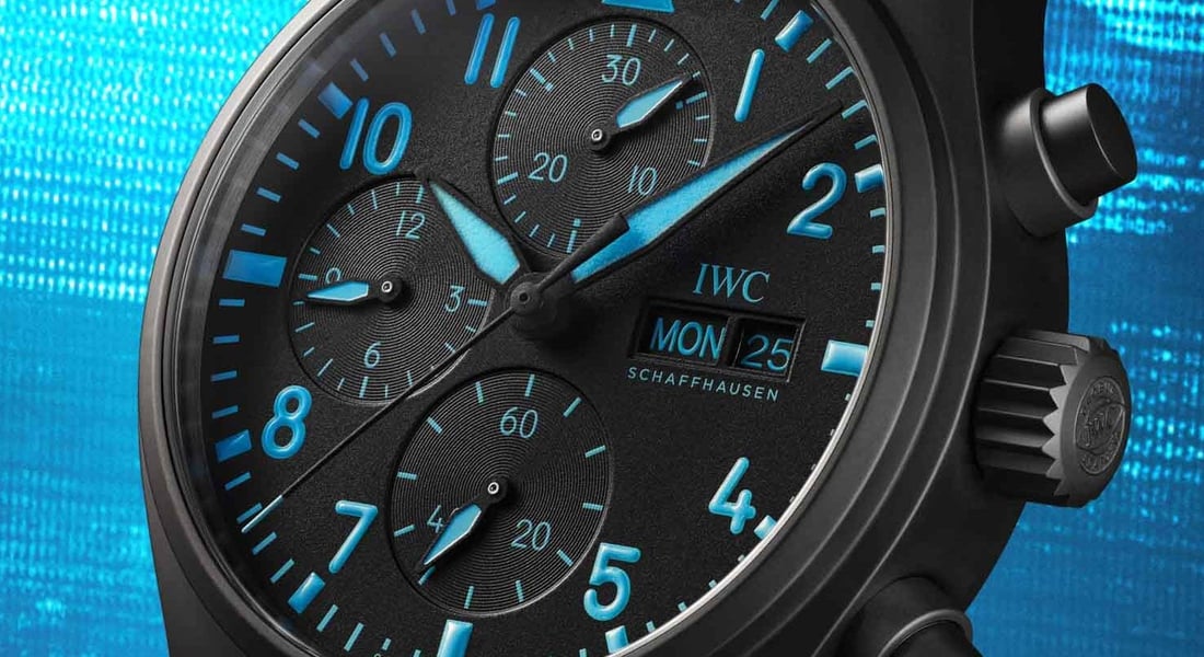 The black dial features an asphalt-like texture and the typical layout with a 30-minute counter at 12 o’clock, a 12-hour counter at 9, and running seconds at 6. The logo and cutouts for the day and date are at 3 o’clock. Finally, the real George Russell touch is that all printing and lume are executed in his signature blue — the same color on his helmet. The textured rubber strap with IWC’s EasX-Change quick-release system also comes in that same color and with a Ceratanium pin buckle.