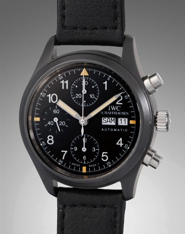 On the picture on the right, you see the ceramic IWC Pilot’s Chronograph reference 3705 that was auctioned by Phillips (picture is also used from their auction catalogue). Compared to the IWC Mark XVIII Edition “Hodinkee”, the hands, markers and Arabic numerals, as well as the case colour, are indeed corresponding.