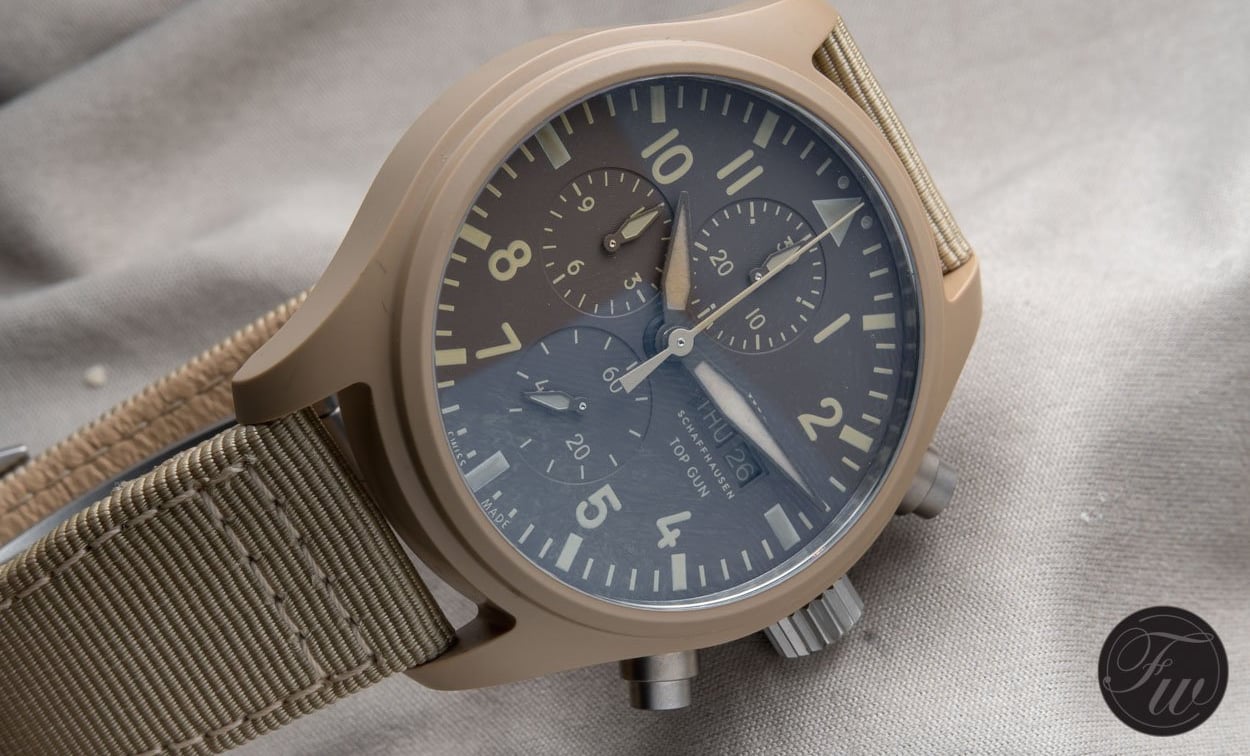 One thing that I have not mentioned above when I talked about the case is that the IWC TOP GUN “Mojave Desert” has a soft-iron inner case that should protect it against magnetic fields as well. As a true pilots’ tool watch, this function comes useful in the cockpit. As well as the fact the crystal is secured against displacement in the event of a sudden pressure drop. The strap that the watch comes on is comfortable (albeit it doesn’t look like that) sand colored nylon with soft leather inlay and deployant clasp. One would have to pay €9.250,= to get an IWC IWC Pilot’s Watch Chronograph TOP GUN Edition “Mojave Desert”. Just as a comparison, the Swiss retail of the TOP GUN “Mojave Desert” is CHF8,900.= Swiss Francs while the time only TOP GUN Automatic is CHF6,100.= Swiss Francs. Not much difference in price, a lot in watches.