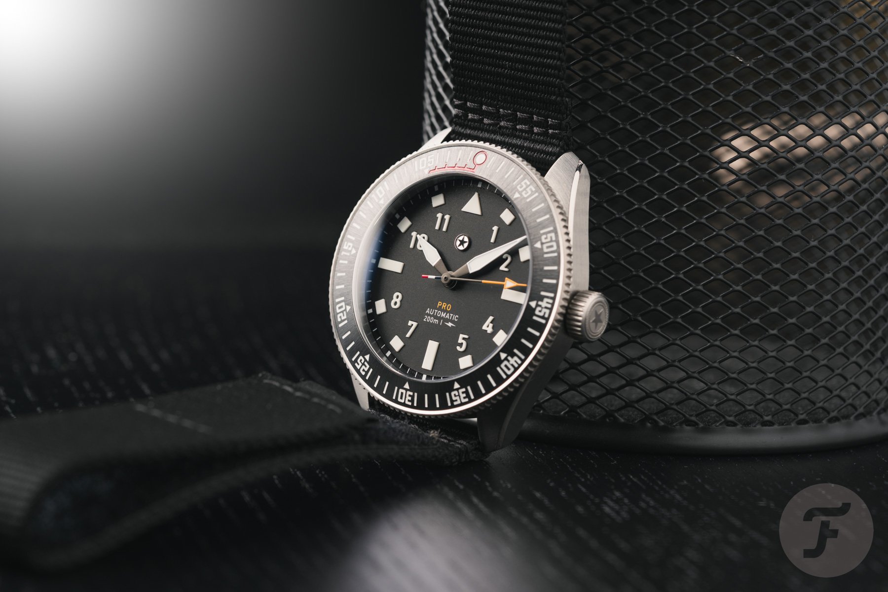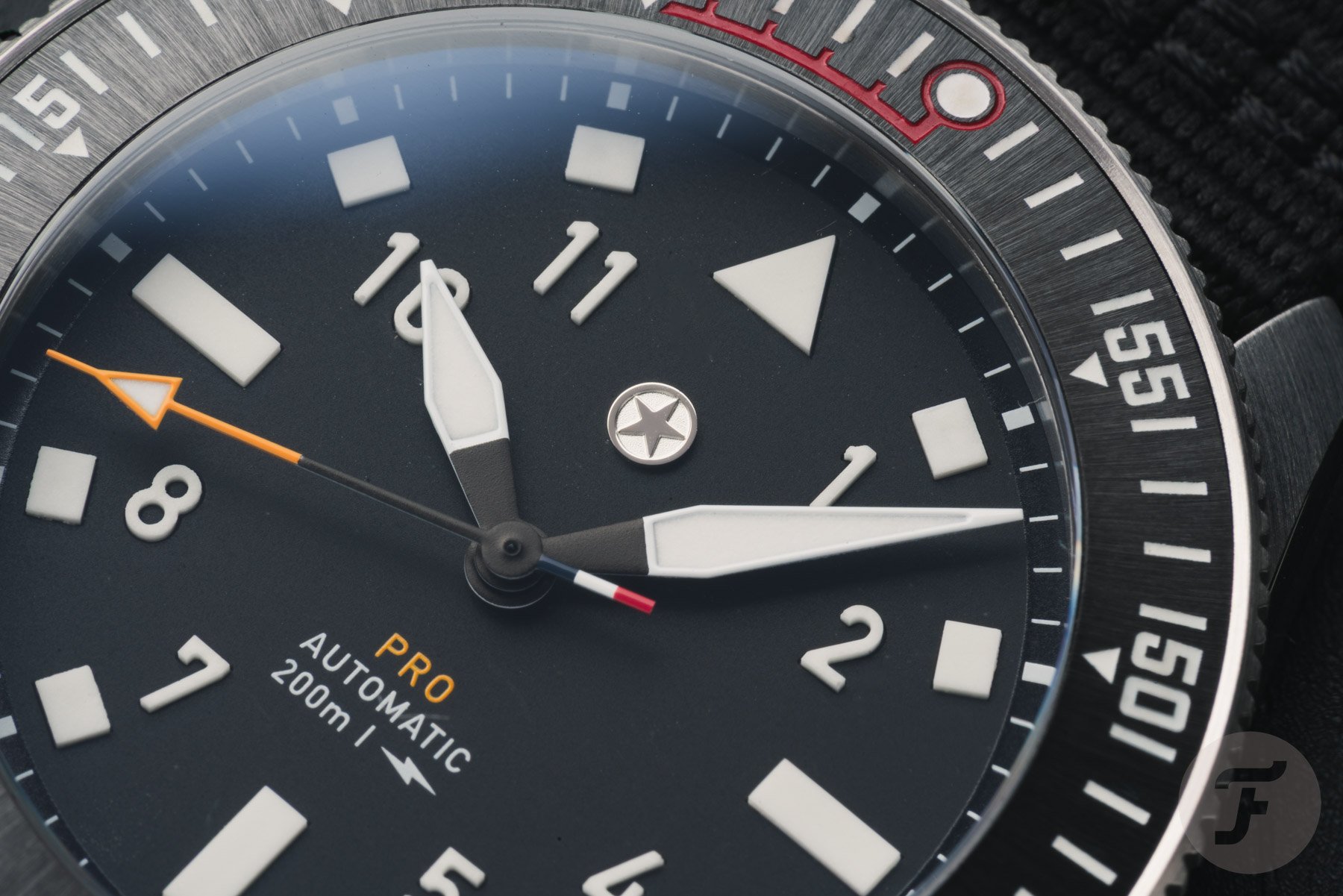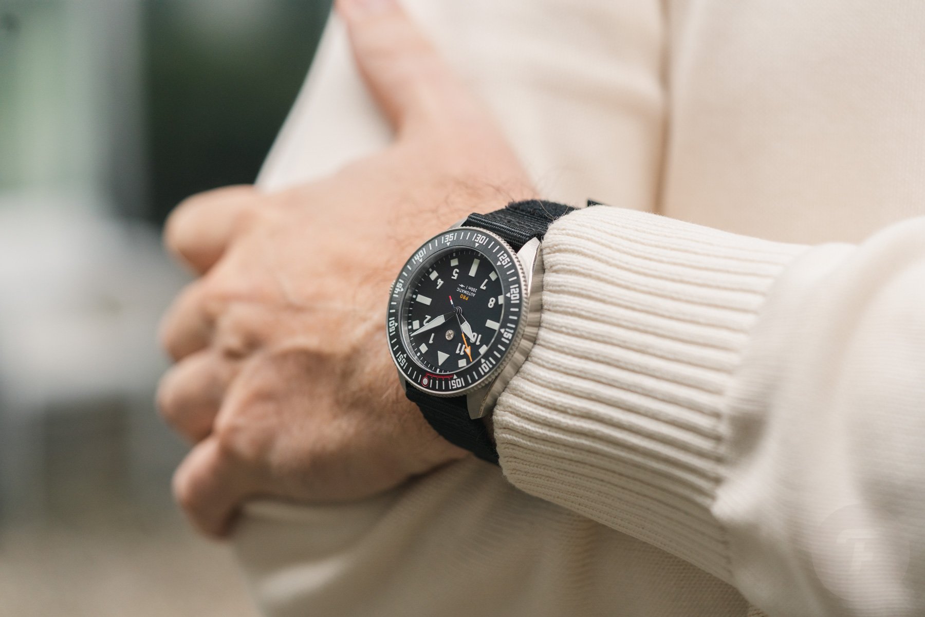 As always with Jack Mason, the red, white, and blue tail of the seconds hand refers to the brand’s Texan roots. The dagger-style hour and minute hands also feature Super-LumiNova Grade X2 for maximum visibility in low light. The Shadow model comes with a black nylon strap featuring a Velcro closure and stainless steel hardware. Overall, I see aesthetic hints of the black Tudor Pelagos FXD and the Sinn EZM series, but the Pursuit Pro still feels distinct.