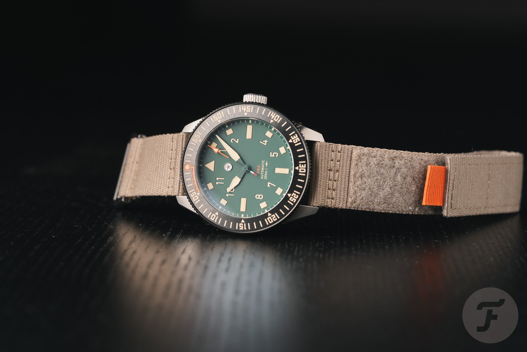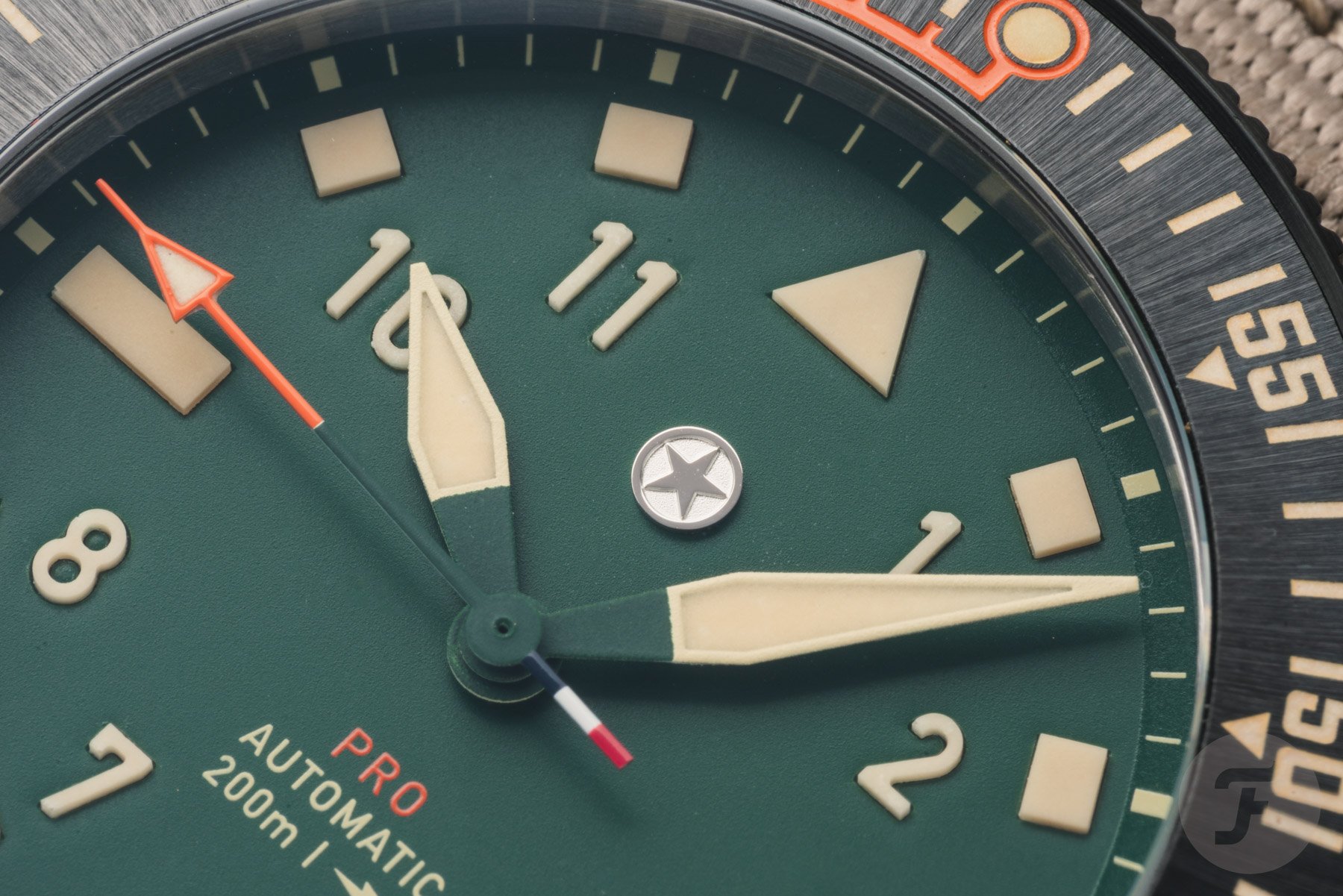 All three hands have a green base, giving them a ghost effect over the green dial. As expected, the seconds hand also has an orange tip and the same red, white, and blue tail used for the Shadow model. The dagger-style hour and minute hands are executed in the same cream color as the indexes and feature Super-LumiNova Grade X2. Overall, this Hunter model has a more outdoorsy style, and I love that. Especially on the sand-colored nylon strap with orange details and stainless steel hardware, it looks like a cool watch for rough, sandy terrain.