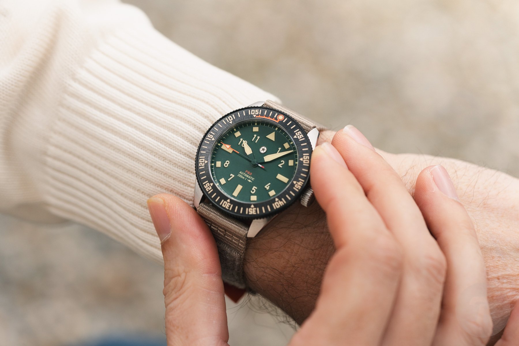 For the Hunter variant, Cho chose a different aesthetic. Its stainless steel case is paired with a black DLC-coated bezel, which contains a black ceramic insert with cream-colored luminous markings. The final five-minute section on the countdown bezel is highlighted in orange, corresponding with the seconds hand and text on the lower half of the dial. Speaking of which, the Pursuit Pro Hunter has a matte green dial with three-dimensional Lumicast markers and numerals in the same cream color as the open minute track and the markings on the bezel.