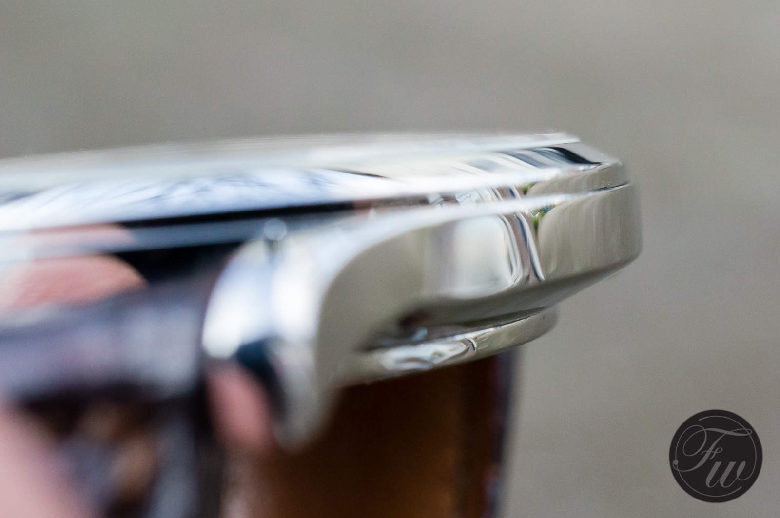 With a casing thickness of only 10.1mm, this watch has a very sleek appearance. It’s helped as well by the form the casing was build in, the sides of the watch are only half of the total thickness. This can be very well seen at the position of the crown which seems to be positioned halfway under the watch. The diameter of the watch is a very comfy 37.2mm, it’s sapphire crystal is slightly domed and the watch is waterproof to 50 meters.