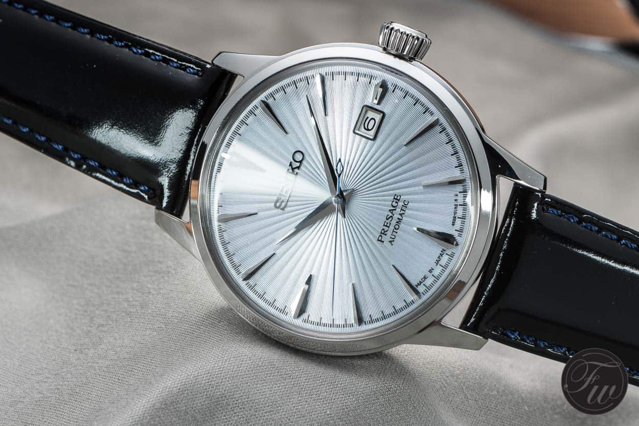 Seiko’s Presage Cocktail Time diameters are 40.5mm for both versions. The thickness of the three-hands is 11.8mm, something you can easily wear under your cuff. However, at some point you might be rolling up your sleeves anyway in the bar. Seiko uses their Hardlex crystal instead of sapphire. To a lot of fans this is a bit of a bummer, but as we explained in this article, Hardlex is good enough for most of us. The price difference between sapphire and Hardlex is too big to really make a difference in terms of quality and characteristics. So Seiko is proud to use Hardlex on many of their watches and keep the price interesting for you, the customer.