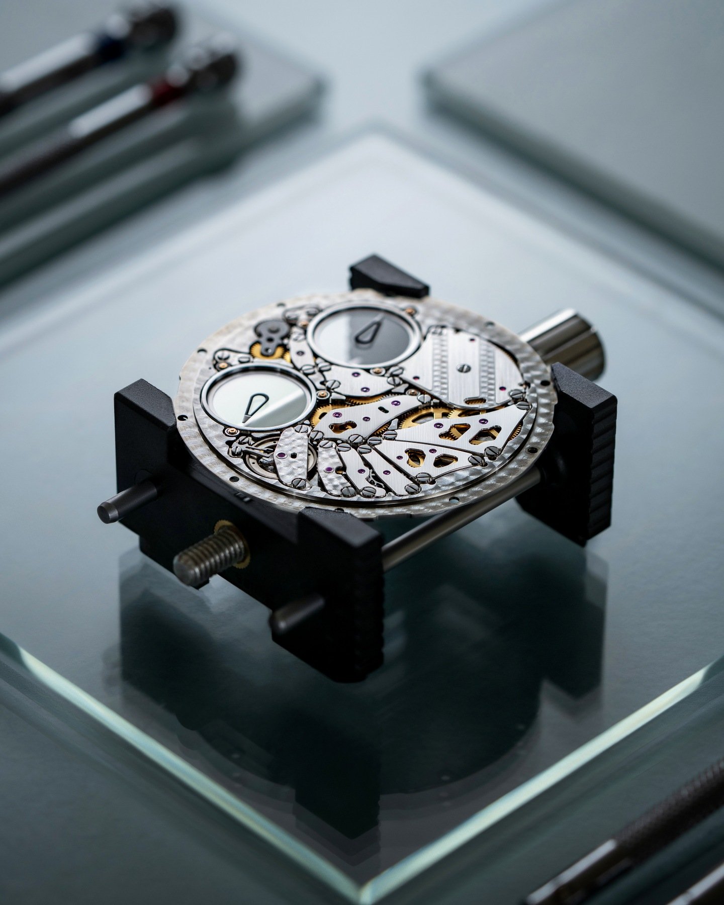 In the ThinKing prototype, the lateral drive transmitted motion to wheels mounted on a central axis. The ThinKing Mystery makes the lateral drive turn solid sapphire discs with three rollers placed around each indicator. These rollers guide the discs’ motion while not draining too much of the mainspring’s energy. This means the power reserve is now greater than in the prototype. The in-house caliber K.23-3.1 now provides 38 hours of autonomy rather than 32. You wind the movement with a special tool, and it comes with a dedicated winding box.