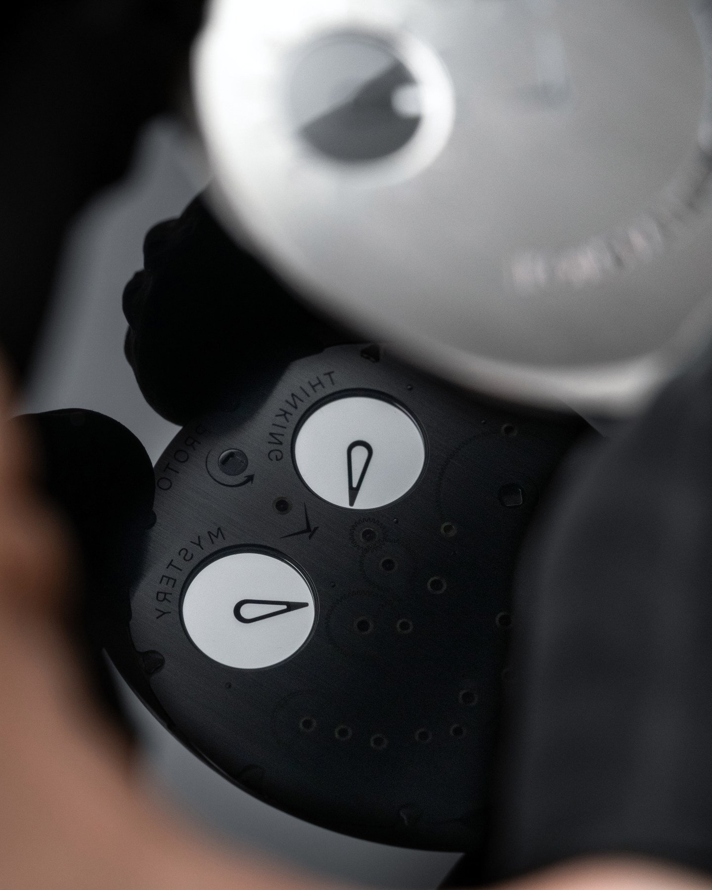 For the ThinKing Mystery, the “eyes” are fully transparent, with the crossbars eliminated from their structure. The concept echoes Chaykin’s Mystery 1000 Jewels, created in 2007 as a tribute to the legacy of Jean-Eugène Robert-Houdin, the illusionist, watchmaker, and inventor. In the 19th century, Robert-Houdin designed a table clock with a single hand driven by a transparent disc. It appeared to float in mid-air while the movement itself remained concealed within the case.