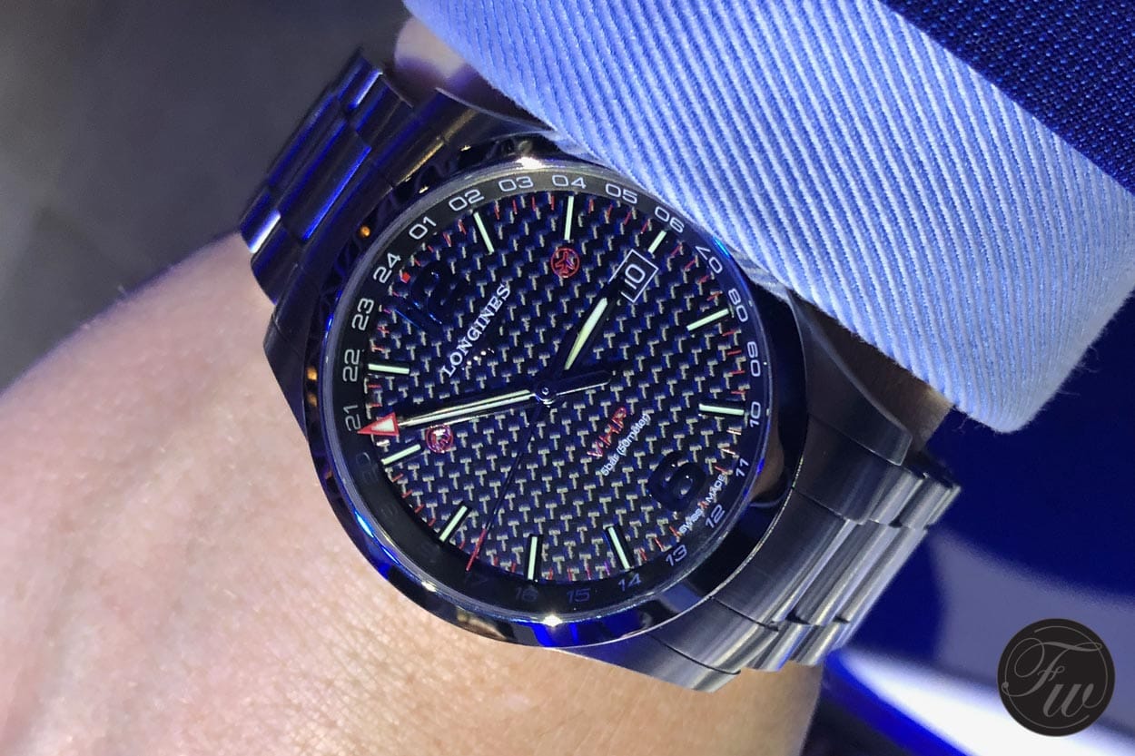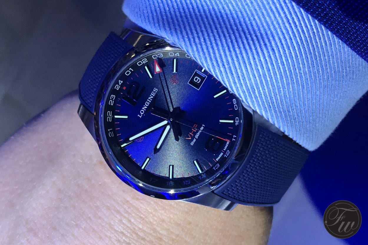 The Longines Conquest VHP GMT Flash Setting will be available in 41 and 43 millimeter. During the presentation the silver, blue and carbon model were on display. Depending on your taste and preference it’s available with a metal bracelet or rubber strap. Just like the standard version it will be available in a black DLC version also. Pricing starts at 1.250 Swiss francs depending on the configuration.