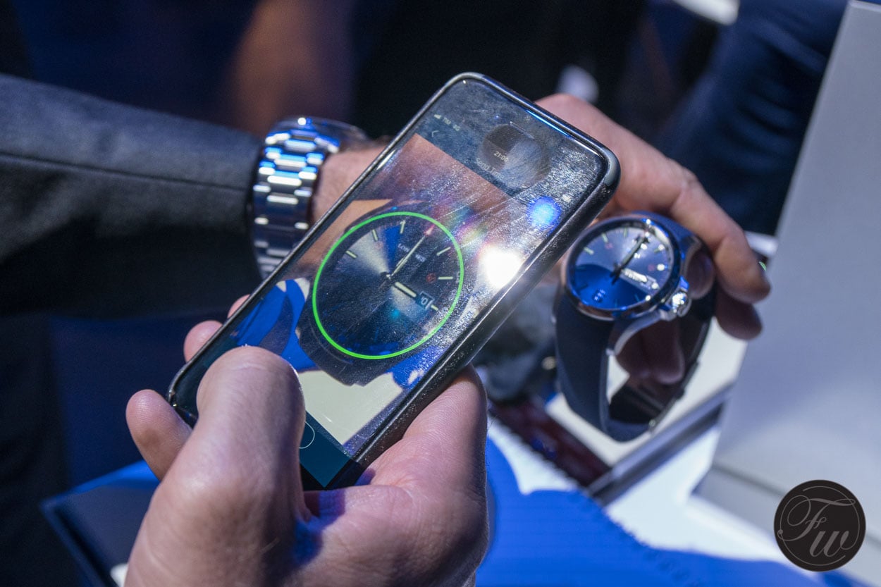 After setting the watch to the Flash Setting you place the camera of your phone over the dial. When done correctly a green ring shows that it recognised the watch. After pressing either home or travel time on the watch the flash strobes in a certain pattern. If you look closely at the dial you will notice a tiny hole in the 1 of the 12 o’clock marker. This is a photo-detector sensor which reads the strobe and adjusts the time accordingly. When giving it a try we learn this works flawless. As mentioned this is the most precise way to set the watch as time on your phone is synchronised online.