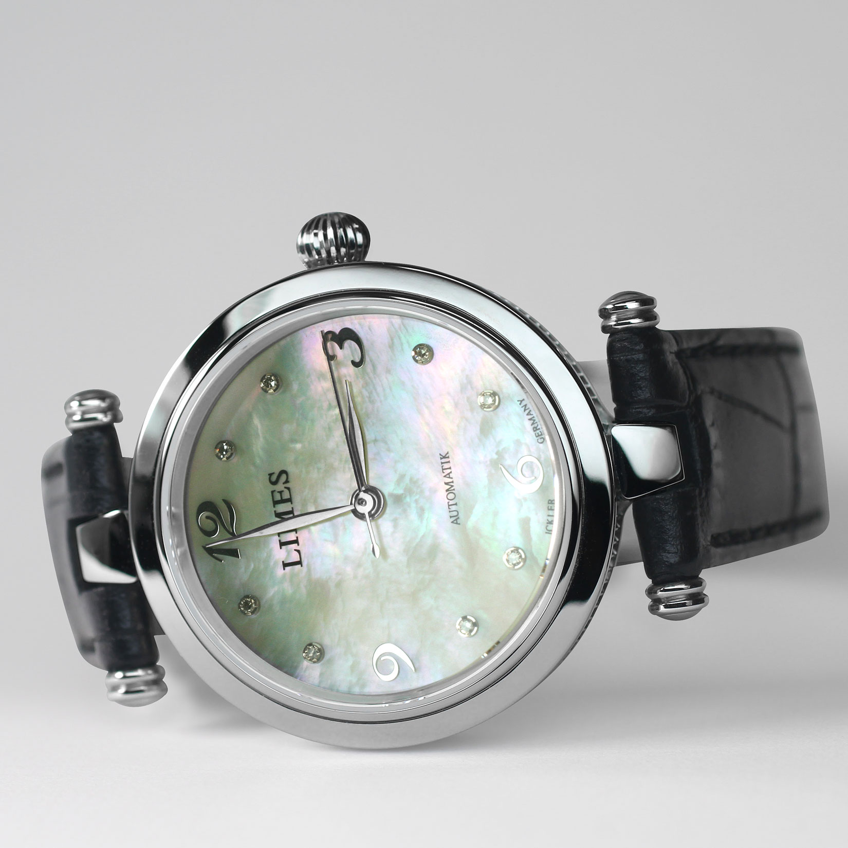 The silky natural Mother of Pearl dial is decorated with 8 genuine diamonds and shimmers according to the lighting conditions in various shades. Each dial is a bit different to the other. So, every Phara mother of pearl is a unique timepiece with beautiful play of colors – no matter what time of day.