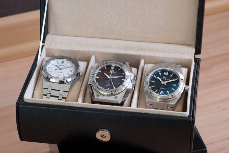 Below, an image of the original 3-Timer in brown in my little watch box with my Royal Oak and Ingenieur 3227. Now you also understand why I like the 3-Timer (or any of the Linde Werdelin designs) so much. It is an old picture, but you get the idea.
