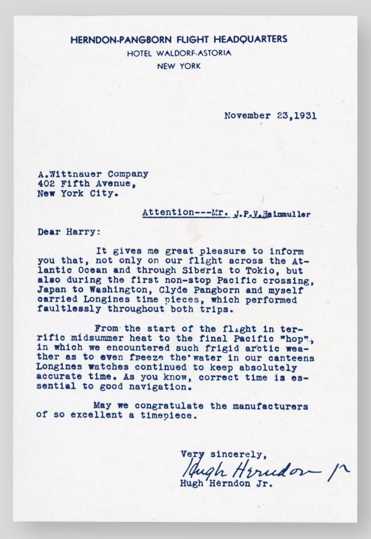 The rest of their journey didn’t go off without a hitch either. Herndon forgot to pump fuel from the supplementary tanks, causing the plane to stall. The ever-daring Pangborn managed to restart the engine after diving down to an altitude of just 1,400 feet (430 meters)! The final issue was heavy fog that made it impossible to land. Running dangerously low on fuel, Pangborn managed to navigate towards an area he was familiar with and successfully land the plane without its landing gear, which had long been jettisoned. In a letter to Longines-Wittnauer, Herndon reported on the flawless time kept by his and Pangborn’s Longines timepieces in spite of the adverse conditions. Such reliable timepieces undoubtedly kept them on course and made their ultimate success possible.