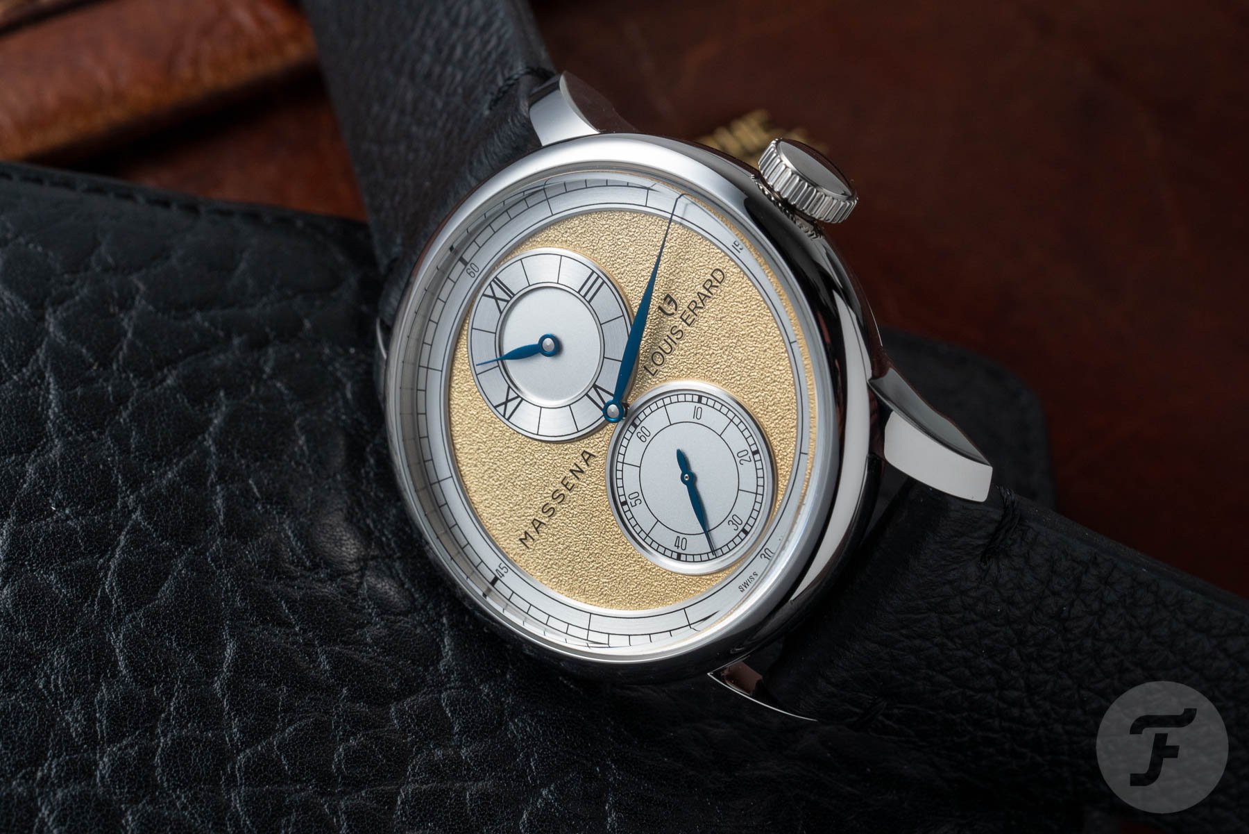 Massena’s dials are made up of two levels. The two flanges on the hour and seconds counters (at 12 and 6 o’clock) are rhodium-plated with a circular satin finish while the centers of the sub-dials are silver-plated opaline. The large central minute hand points towards the outer rhodium-plated flange with a circular satin finish. Louis Erard used rhodium or gold plating for the lower plates, opting for a grained finish to further increase the contrast with the counters and enhance the readability of the gorgeous blued-steel leaf hands. Finally, a signature Massena LAB crown adorns the case at the traditional 3 o’clock position. Louis Erard presents both watches on a black grained calf leather strap with tone-on-tone stitching and a polished stainless steel pin buckle.