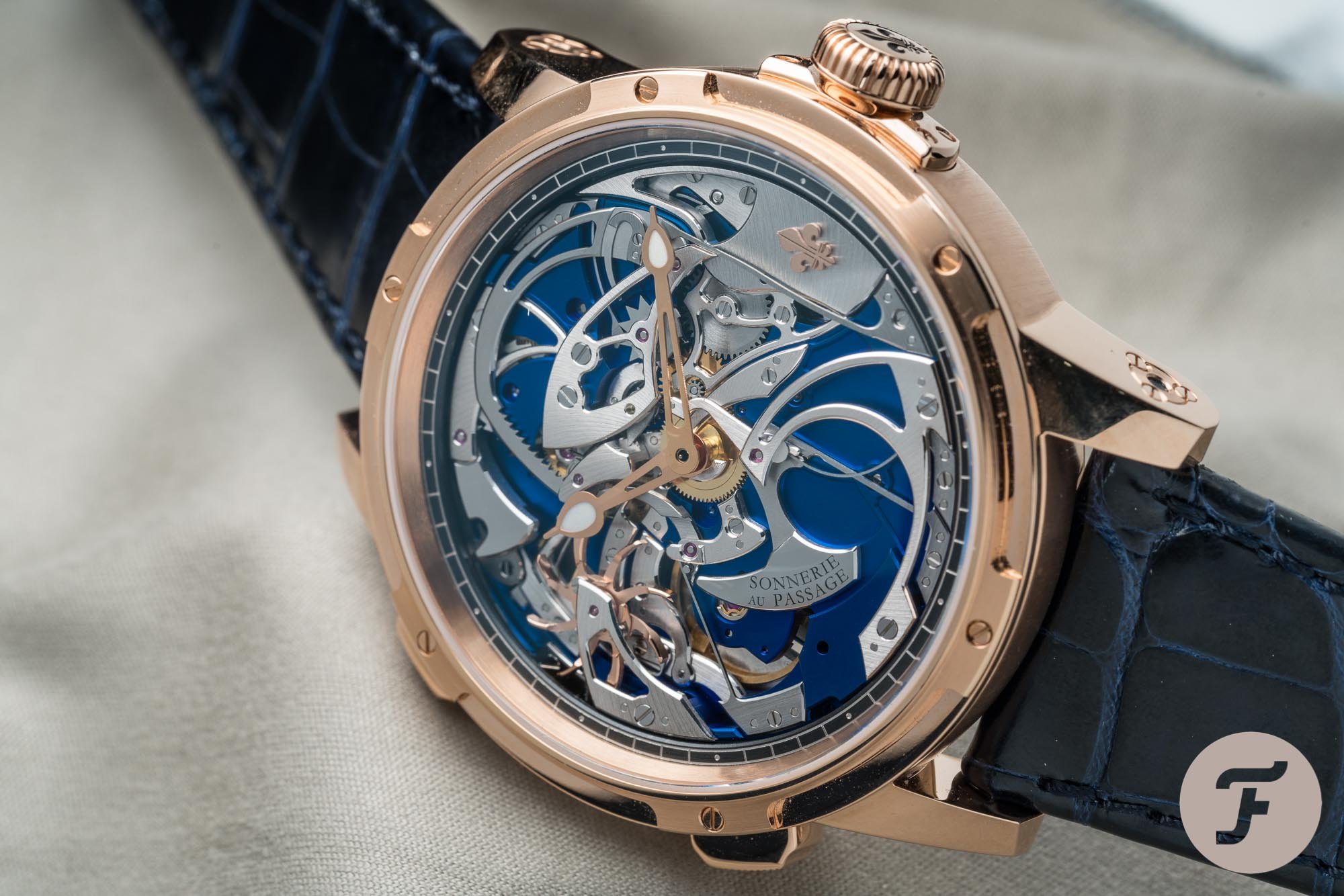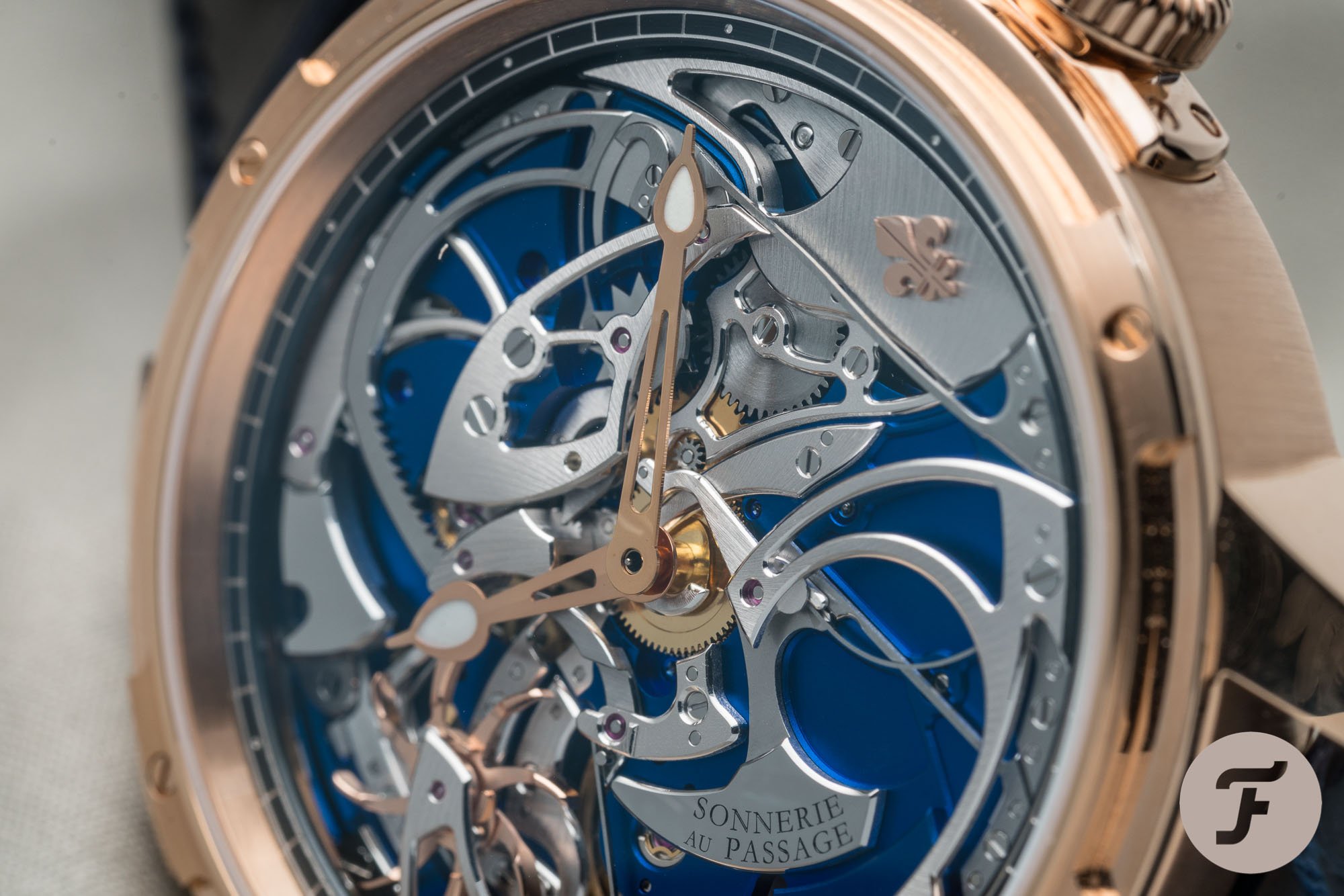 For those who know the brand, they will recognise the case design. This alone is a work of art as it consists of 65 different elements. But the 46,5mm case, although beautiful and detailed, isn’t what your attention is drawn to. With the lack of a traditional dial, the highly complicated movement is fully exposed, and all essential parts are visible through the sapphire glass. Just under the central position of the hands, you find the words ‘Sonnerie au Passage’. Sonnerie translates to ring or alarm in French and au passage means in passing.