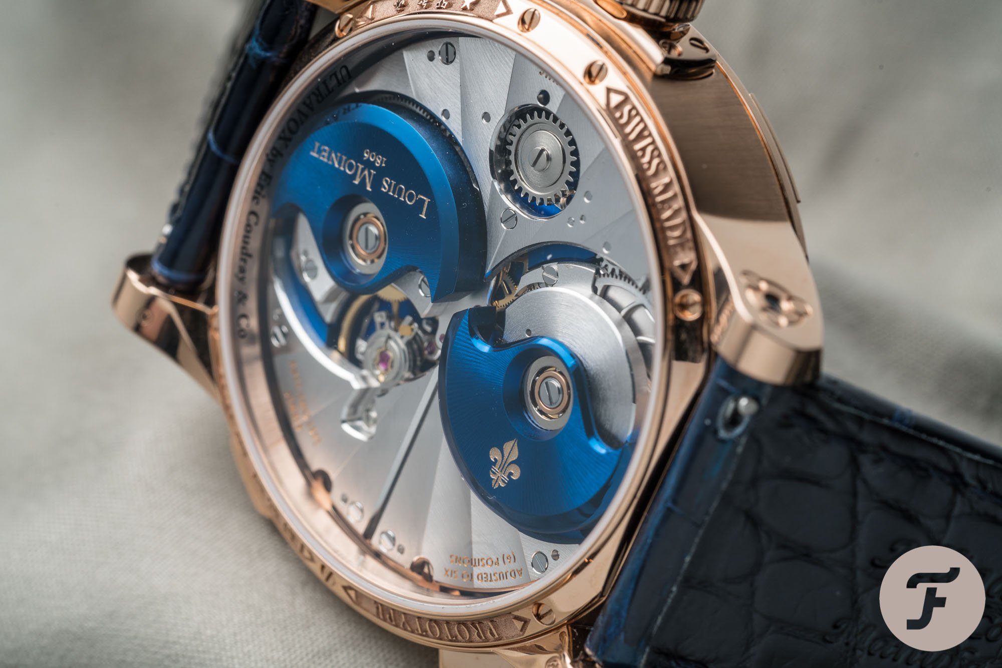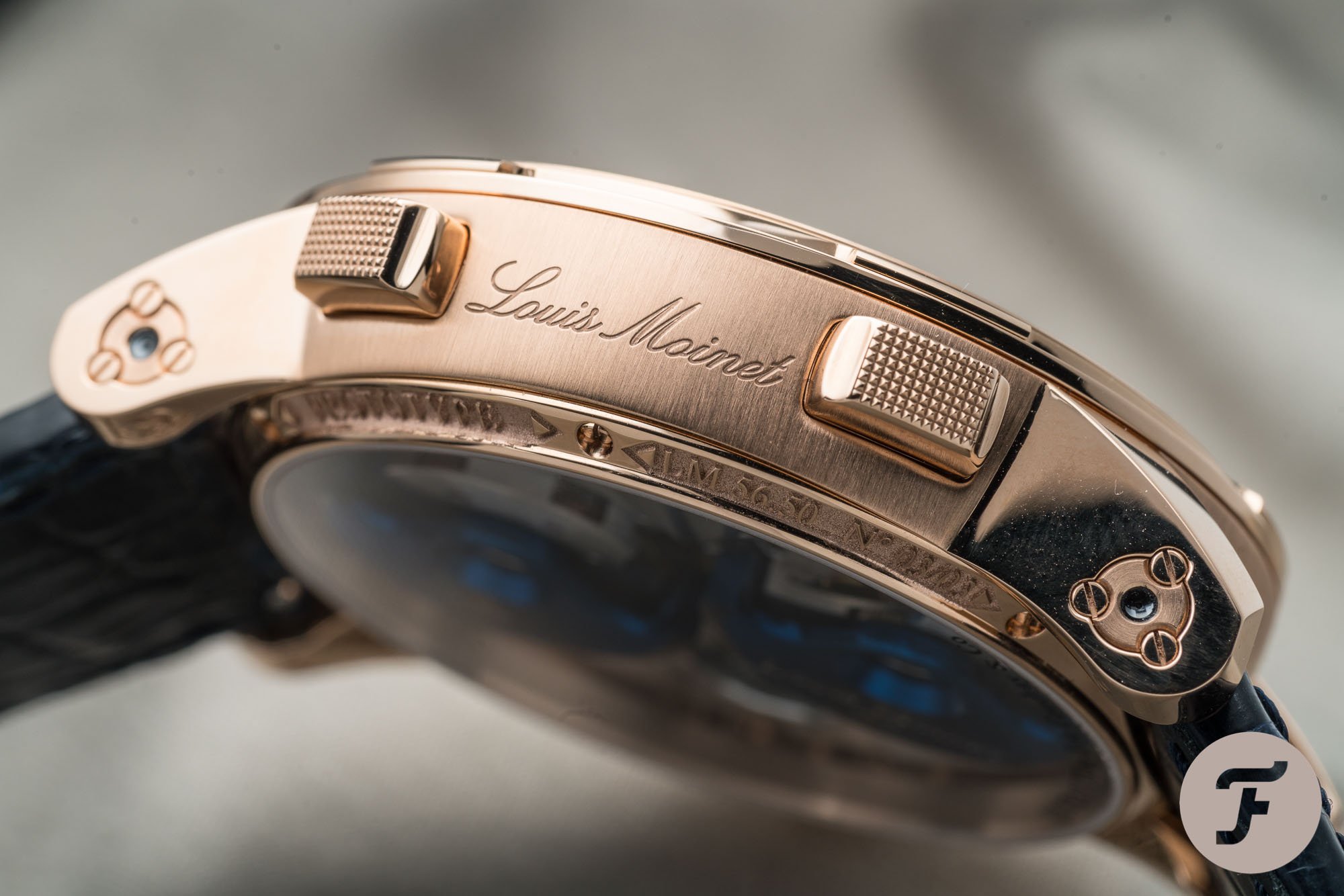 On both sides of the watch, you will find the typical ‘Moinet Blue’ colour. This rich and deep, yet bright blue always is an eye-catcher. You can wonder whether such a stunning piece of Haute Horlogerie needs it, but it looks incredibly good. Especially combined with the 18K rose gold case.