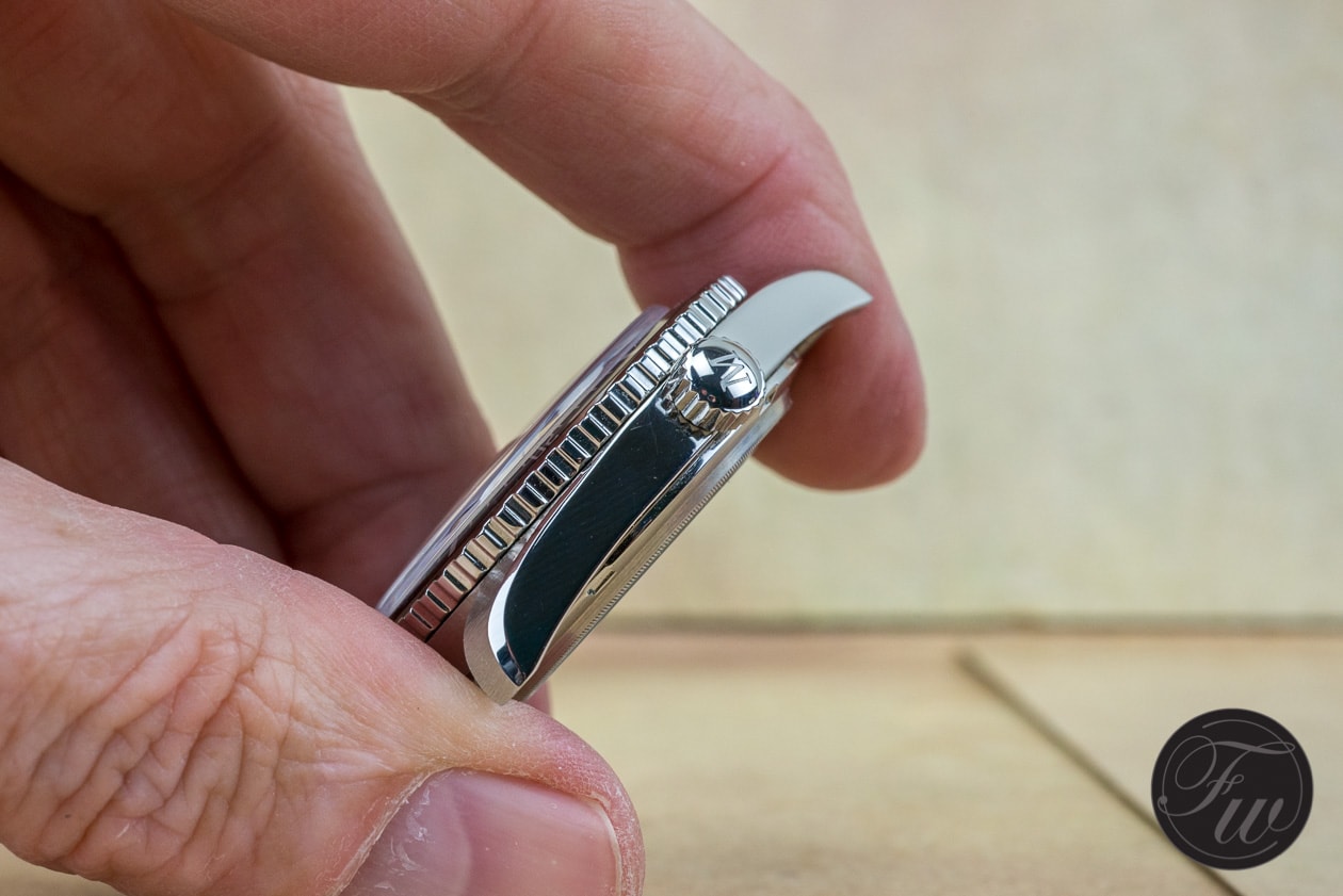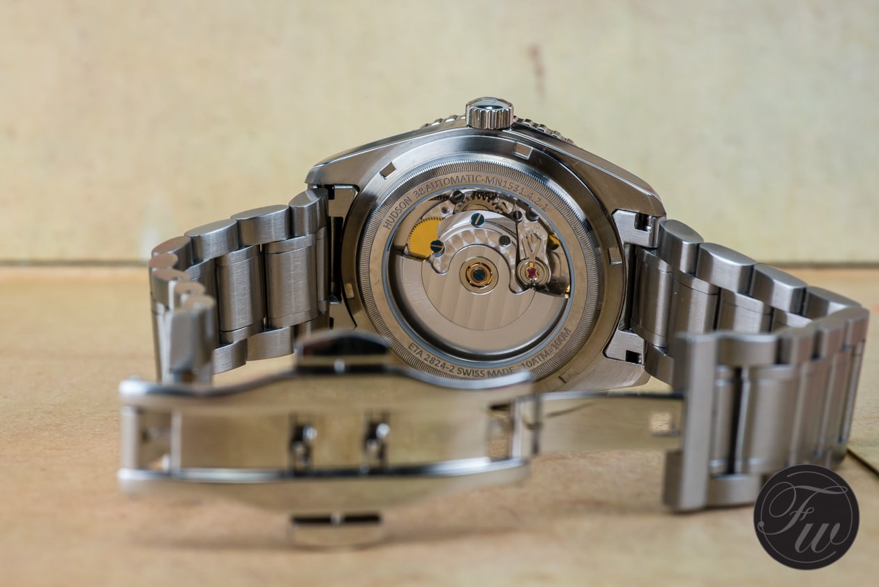 For me less obvious in this case is the choice for a glass case back, like the prototype watch I’m wearing is equipped with. I’ve seen ETA 2824’s enough meanwhile, and see that the finish of the movement (at least used in my prototype) is with fake blued screws; so not for me. But guess what, upon request, the Maen Hudson 38 Automatic will be available with a solid steel case back as well. Which directly provides another advantage, a higher water resistance rating. While the watch with a sapphire glass back is pressure proof to 10 ATM, the one with a steel case back is 20 ATM. The latter more suitable for a dive watch anyhow.