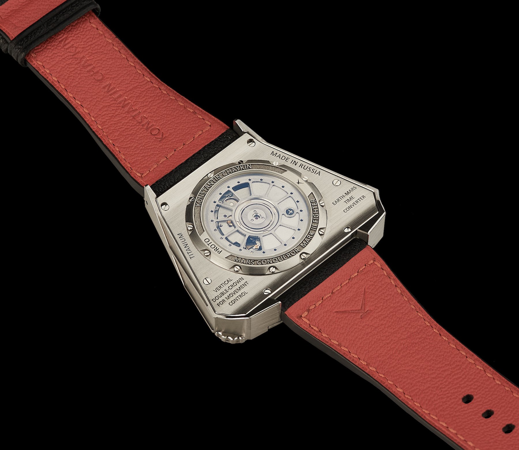The trapezoid case shape might not be the best of choice for a mission watch. Yet, it works well with this timepiece. Not to mention the 24 screws around the bezel. They resemble the mooring lock of a spaceship. Speaking of which, the Mars Conqueror Mk 3 Fighter’s case is titanium with a sapphire display case back. Through that, you can admire the ETA2893-2 base movement that Konstantin Chaykin modified.