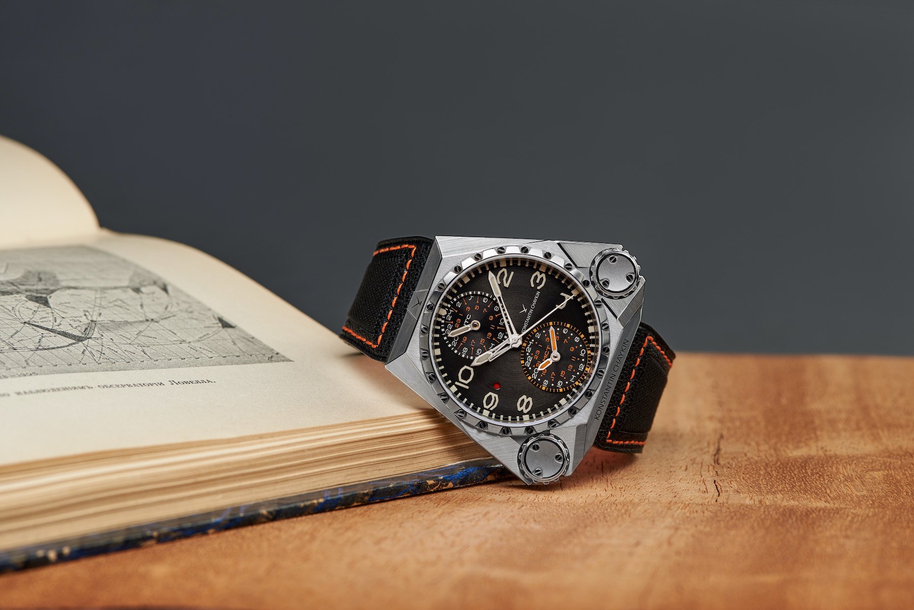 Still, if we want to fully understand its functions, we have to go back in time. To 2009, when, for another project, Chaykin patented a system controlling the function of the winding crown. Basically, the watch has two vertical crowns. One winds the movement and sets the time. By adjusting the other, the owner can switch between modes. Where else have I seen similar layouts? On aircraft dashboards. Now you can’t unsee it.