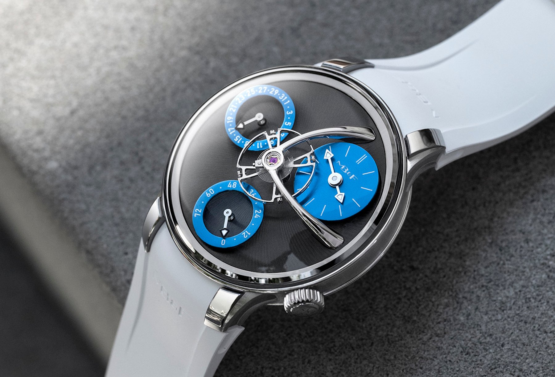But the dial of the limited edition certainly looks different, and there is a very good reason for that. Black and blue are the corporate colors of Westime, whose Beverly Hills location is hosting one of MB&F’s first LABs. This is a retail concept introduced for locations that aren’t big enough to host an actual M.A.D. Gallery. To celebrate this occasion, MB&F introduces the Beverly Hills limited edition in collaboration with Westime. There will be 25 pieces of this version with a black base plate and blue sub-dials.