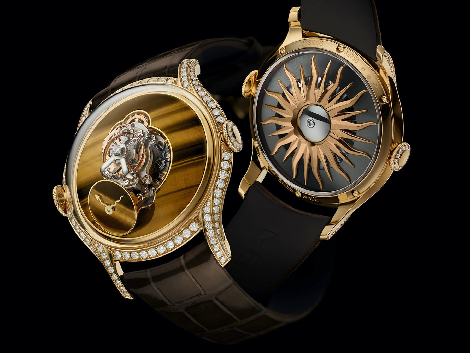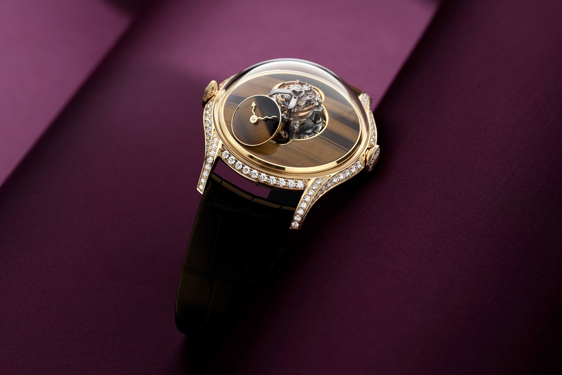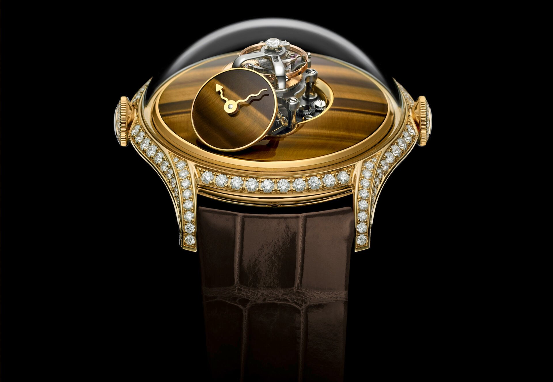 The round 38.5mm gold case with elongated lugs is fully set with diamonds. An extravagantly convex dome of sapphire crystal steeply rises from the widely flaring case. The 20mm total height provides enough space for the column-like flying tourbillon mechanism to fit, but it also draws attention to the anti-reflective sapphire. For symmetry, MB&F has included two functional crowns — one at 3 o’clock and one at 9 o’clock. The crown on the left is for winding the watch, while the crown on the right is for setting it. The crowns and buckle are also set with diamonds (120 on the case, 21 on the buckle, one on top of the tourbillon cage, and 26 for the crowns), making 168 stones with a total weight of 1.7 carats.