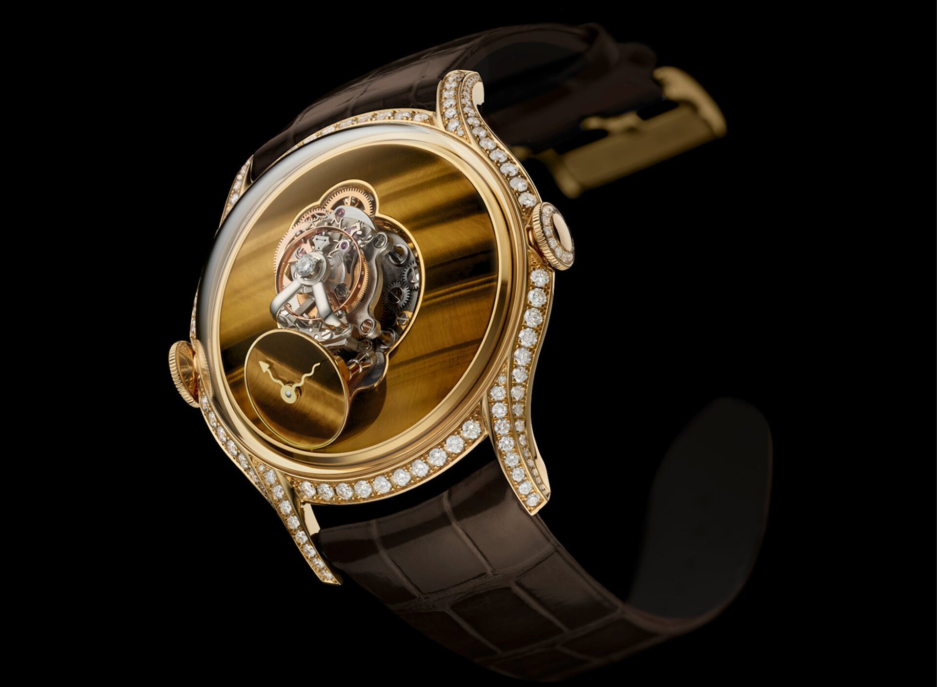 MB&F is adding a “Tiger Eye” version to the LM FlyingT collection. Love the name. What is tiger eye? It is a golden brown gemstone. According to MB&F, “…in some parts of the world, it is believed to ward off the evil eye. Roman soldiers wore engraved tiger eye to protect them in battle.” Here, the stone takes the form of the dial plate and sub-dial of the latest Legacy Machine FlyingT (T stands for Tourbillon) in an 18K yellow gold case set with diamonds.