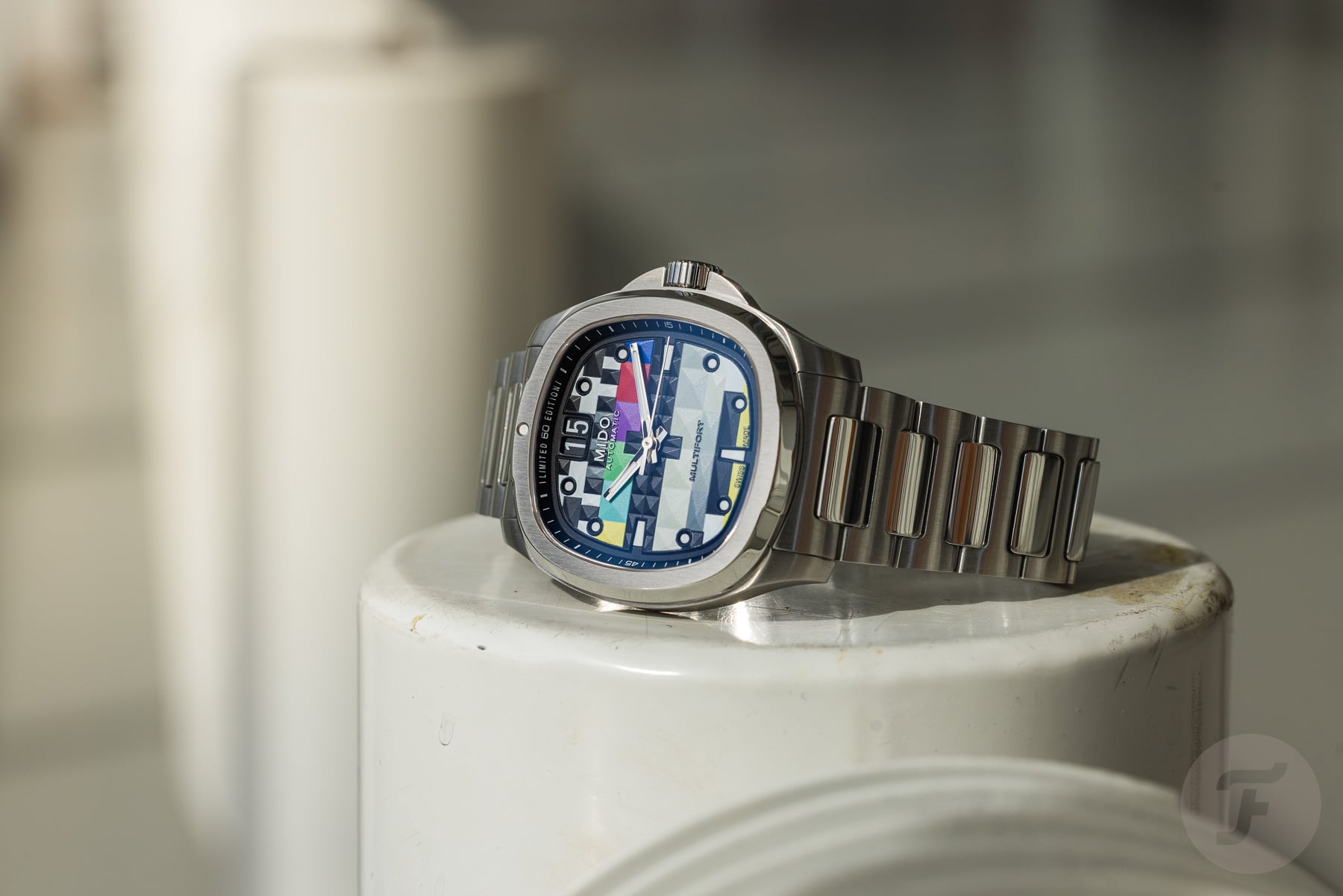 Last August, I tried on two versions of the Multifort TV Big Date with way more regular screens, sorry, dials. Mido already released watches with a TV-style shape in 1973, 1980, and 2000, and to celebrate the 50th anniversary of that style, the brand presented the Multifort TV Big Date. That watch not only made me think of an old-fashioned television set but also of the Patek Philippe Aquanaut. Well, the special edition with a test screen for a dial certainly won’t provoke a comparison with a high-end sports watch from the brand with the Calatrava cross as its logo.