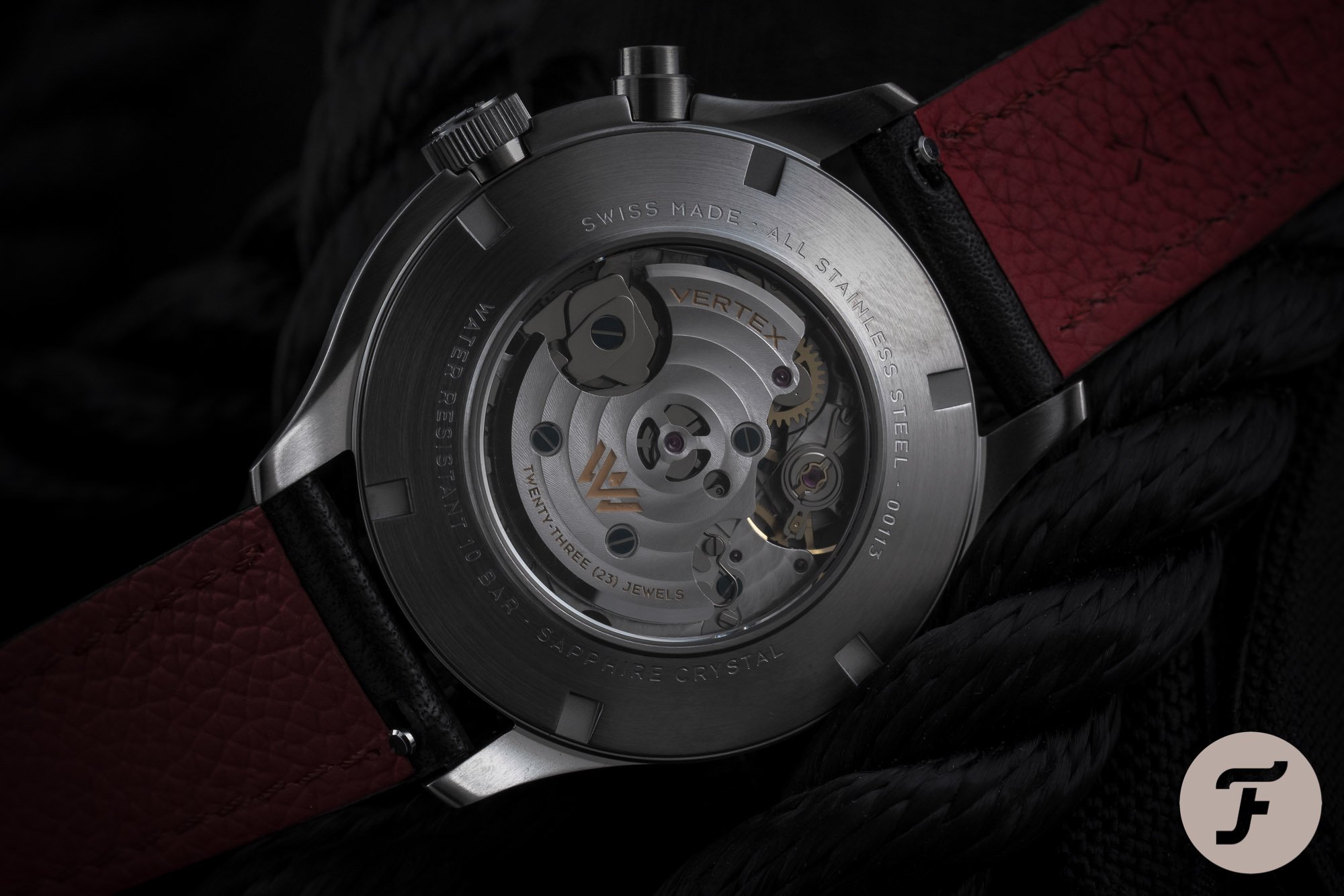 Not because a hand-wound movement is better than an automatic movement, but since there’s a transparent case back on the Vertex MP45 monopusher chronograph, it is nice to see as much as possible. With an automatic version, half of the view is blocked by a rotor, and now you can at least see everything in a glance.
