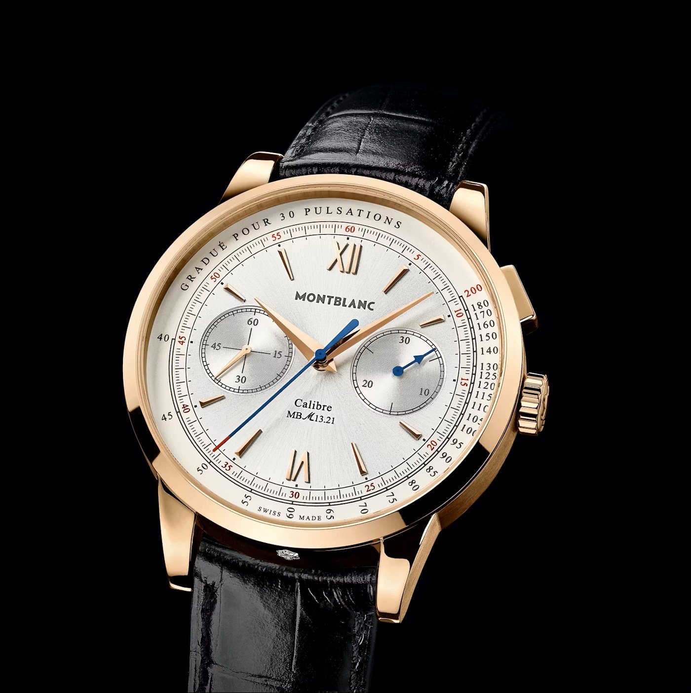 In 2019, Montblanc introduced the first edition of a traditional split-second chronograph powered by the newly developed MB M16.31. As with all modern Minerva movements, the MB M16.31 is meticulously decorated by hand to a standard rarely matched in serial production. The inaugural version featured a black dial paired with a bronze case, and Montblanc has released several additional case-and-dial combinations since then.