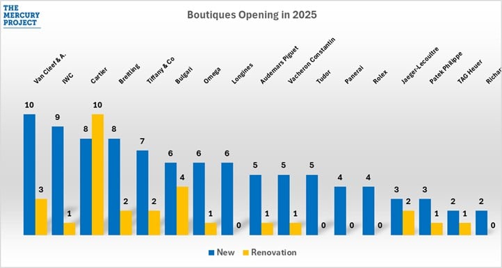 According to The Mercury Project, a Swiss-based data-driven consulting company specializing in the watch and jewelry retail industry, monobrand watch boutiques are on a continuous rise. Despite a challenging retail environment for watches and jewelry in 2025, industry-leading brands continue to invest steadily in new monobrand boutiques and store renovations. A closer examination of these initiatives reveals emerging strategic patterns, both geographically and at the brand level. In 2025, 26 brand-exclusive boutique openings, renovations, and relocations occurred worldwide. These involved 17 major watch and jewelry brands (see the list in the chart above).
