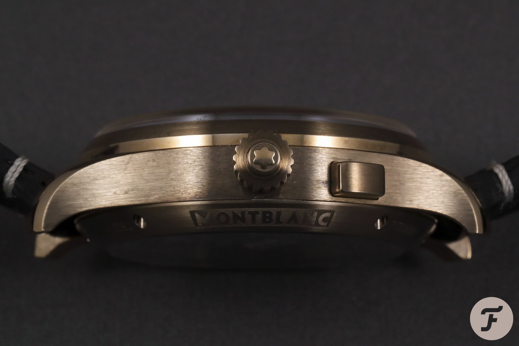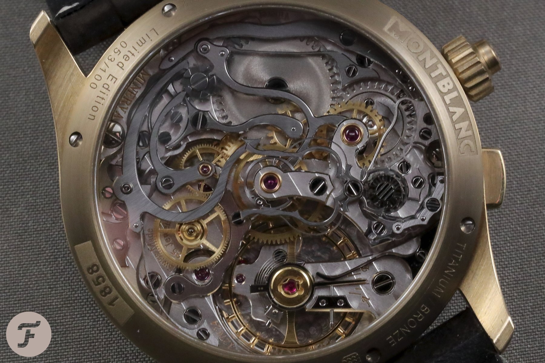 If you look at the side of the watch you will see that the crown and the split-second pusher are not aligned. Normally, this suggests a modular movement. Although there are some good examples out there, many consider modular chronographs as exclusively inferior to their integrated counterparts. But this is not the case here. The movement in the Montblanc 1858 Split Second Chronograph is not only integrated but also exquisitely finished. Welcome to yet another exception to yet another rule.