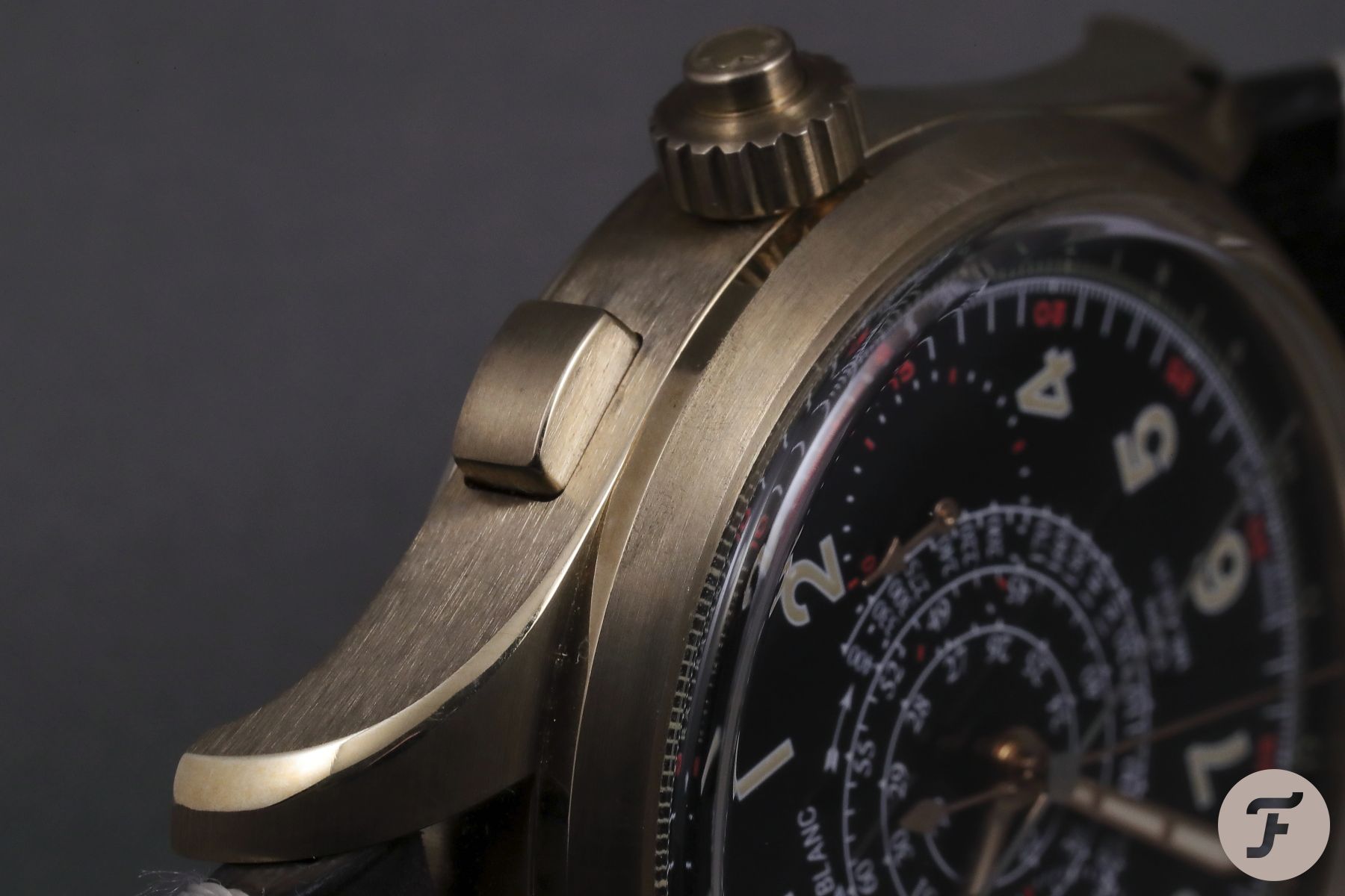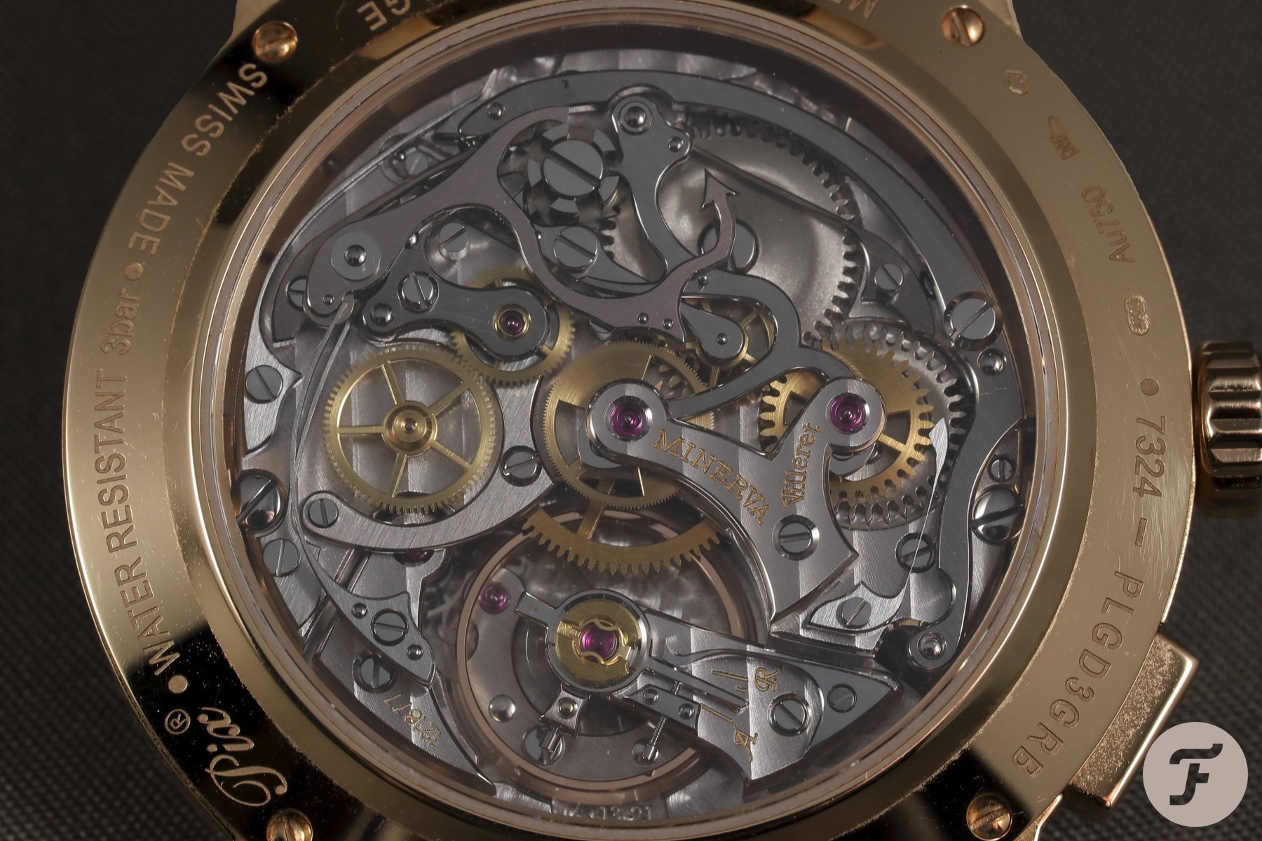 First, the silver hand marks the normal chronograph function, and then the golden hand takes over until you press the split-second pusher again. I can live with that as there is one moving and one stopped hand, but functionally it doesn’t make sense. It is normally the other way around. Whether this mode of operation is historically inspired is unknown. If I ever get the chance to mine Minerva’s archives, I will endeavor to find out.